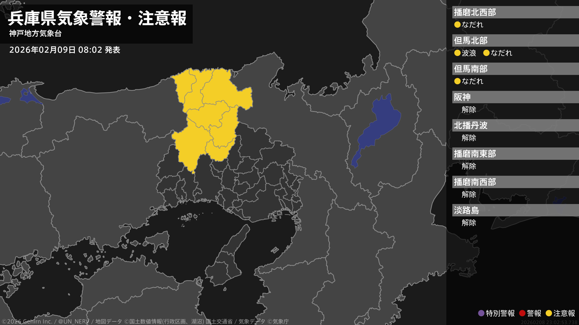 【兵庫県 気象警報・注意報 2026年02月09日 08:02】北部では、9日夕方まで高波に注意してください。兵庫県では、11日までなだれに注意してください。#気象警報注意報 #兵庫県