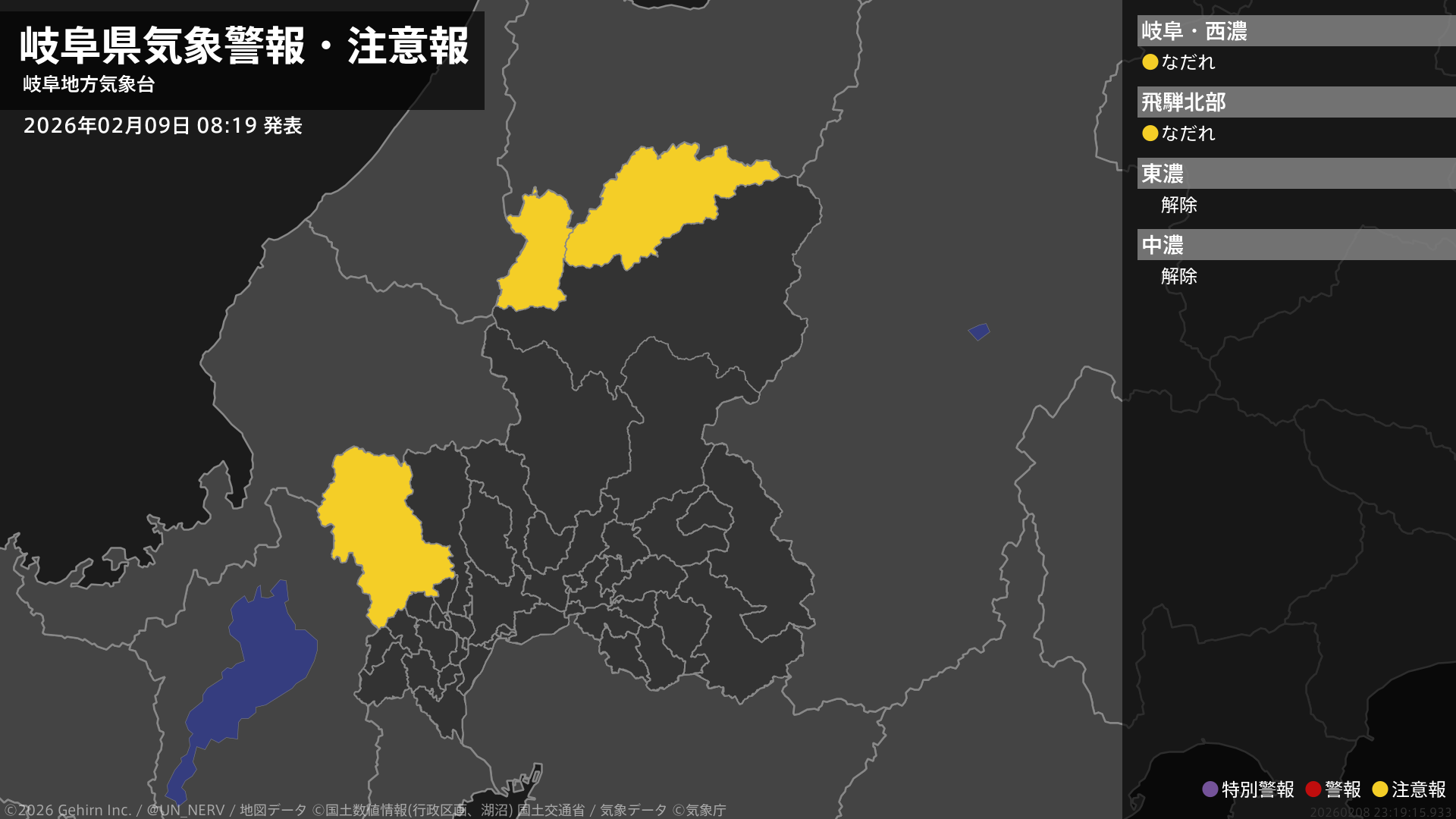 【岐阜県 気象警報・注意報 2026年02月09日 08:19】