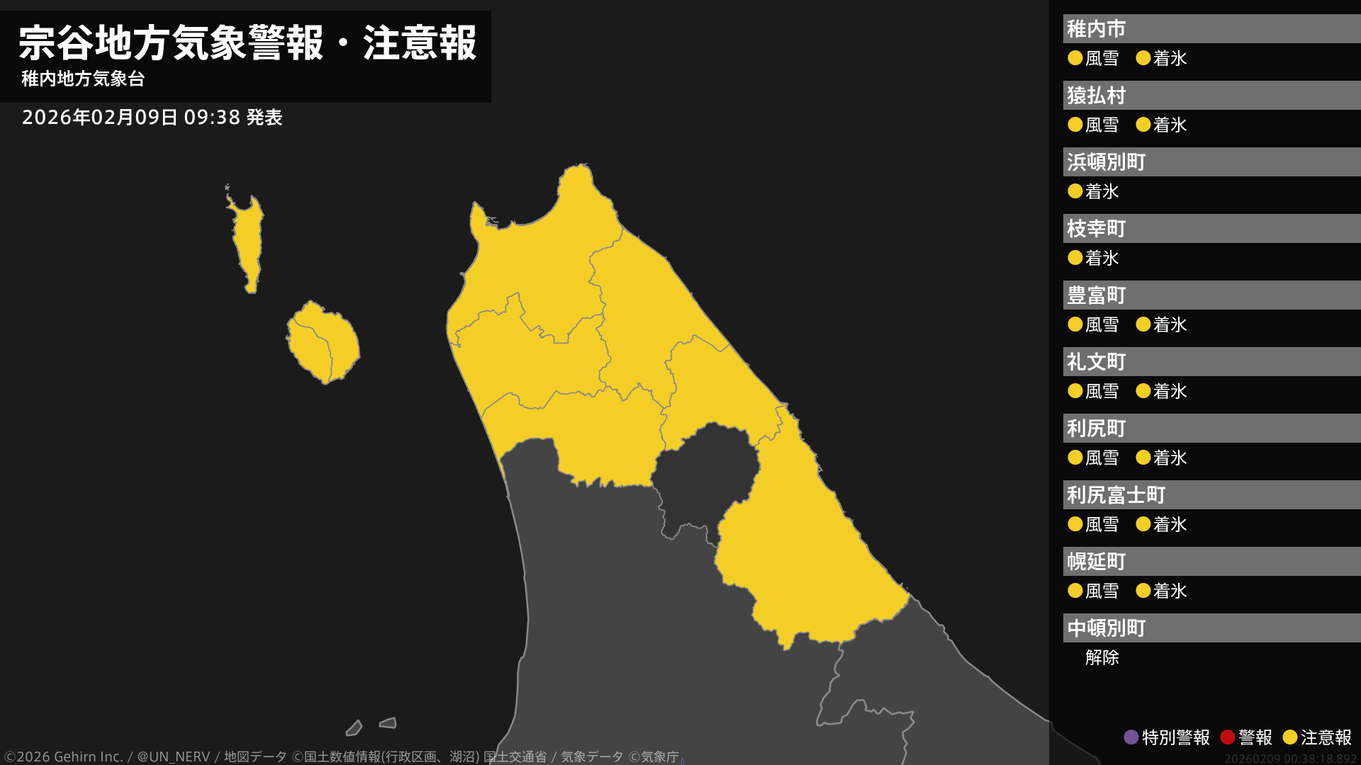 【宗谷地方 気象警報・注意報 2026年02月09日 09:38】