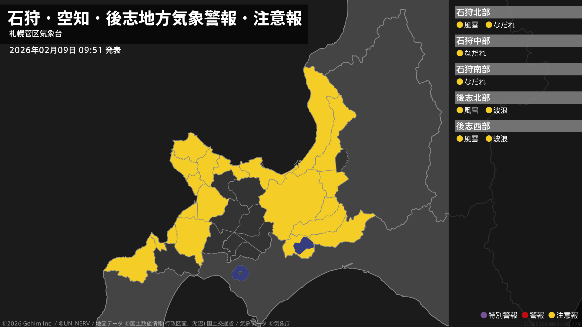 【石狩・空知・後志地方 気象警報・注意報 2026年02月09日 09:51】