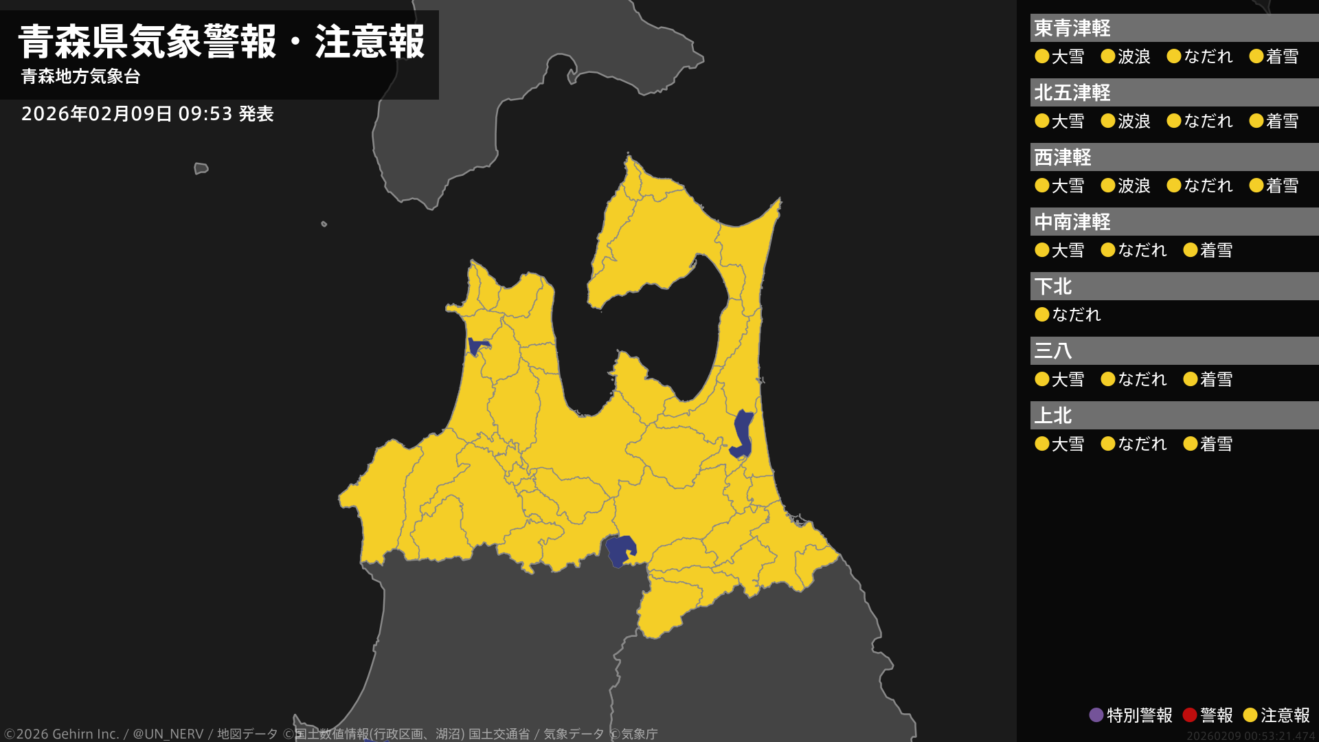 【青森県 気象警報・注意報 2026年02月09日 09:53】