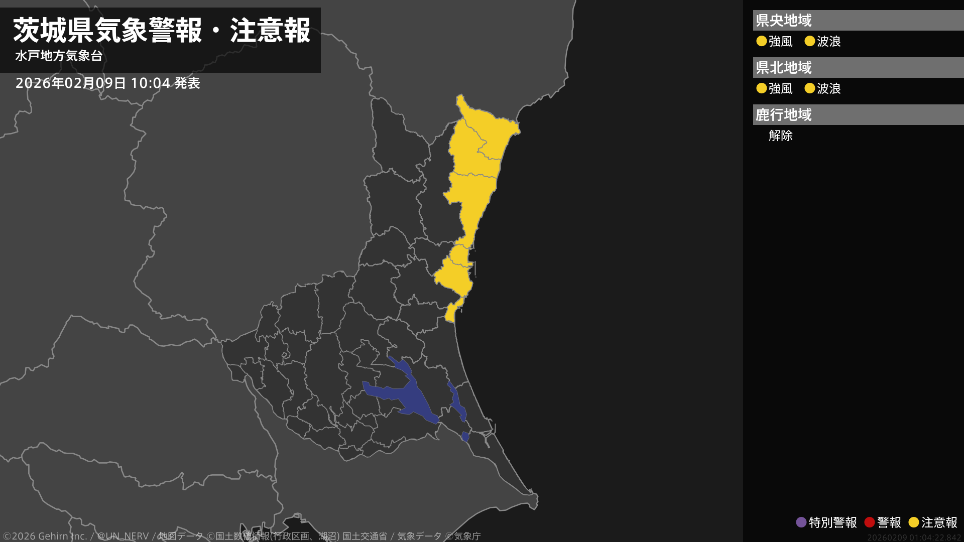 【茨城県 気象警報・注意報 2026年02月09日 10:04】