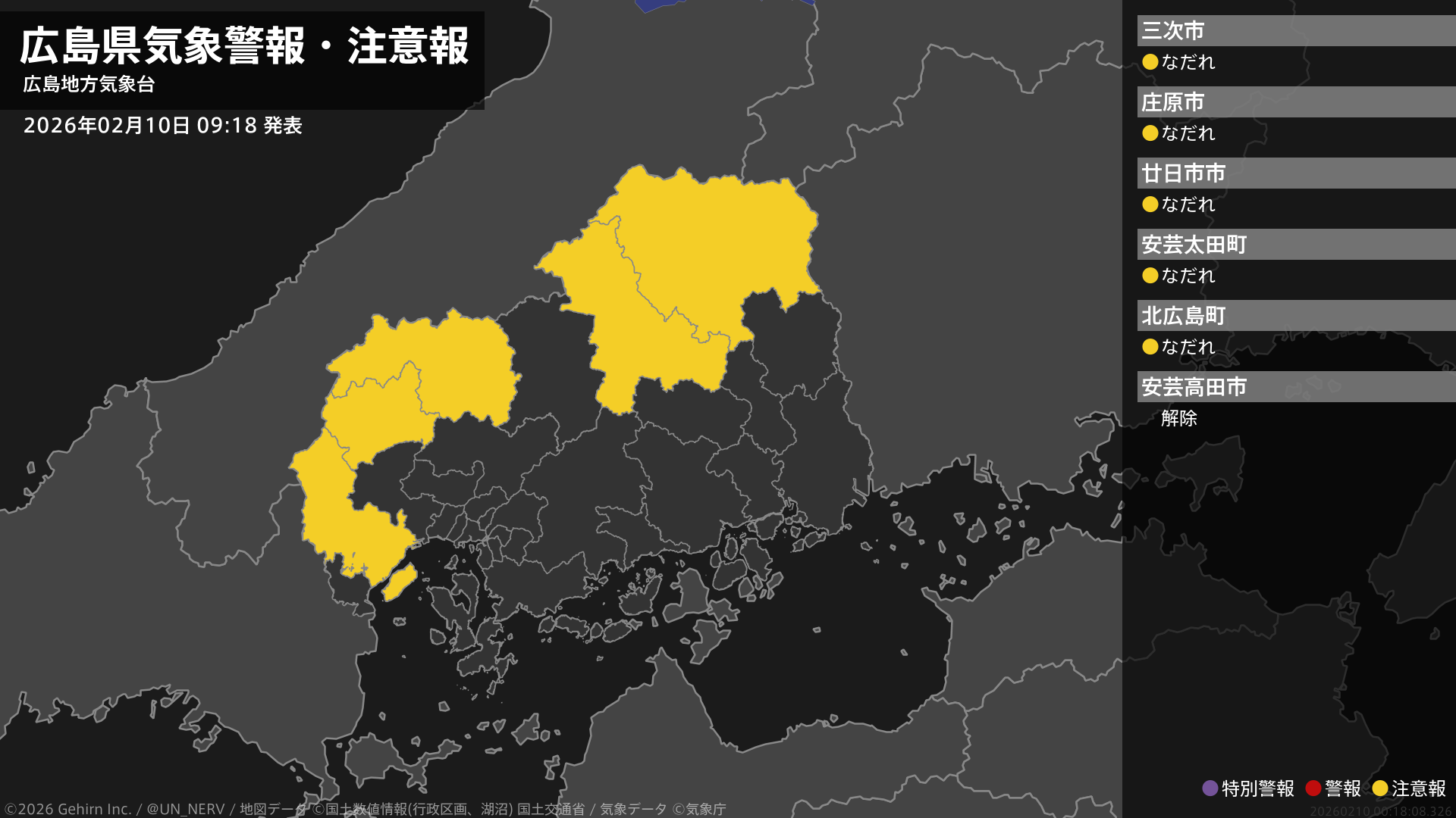 【広島県 気象警報・注意報 2026年02月10日 09:18】広島県では、11日までなだれに注意してください。#気象警報注意報 #広島県