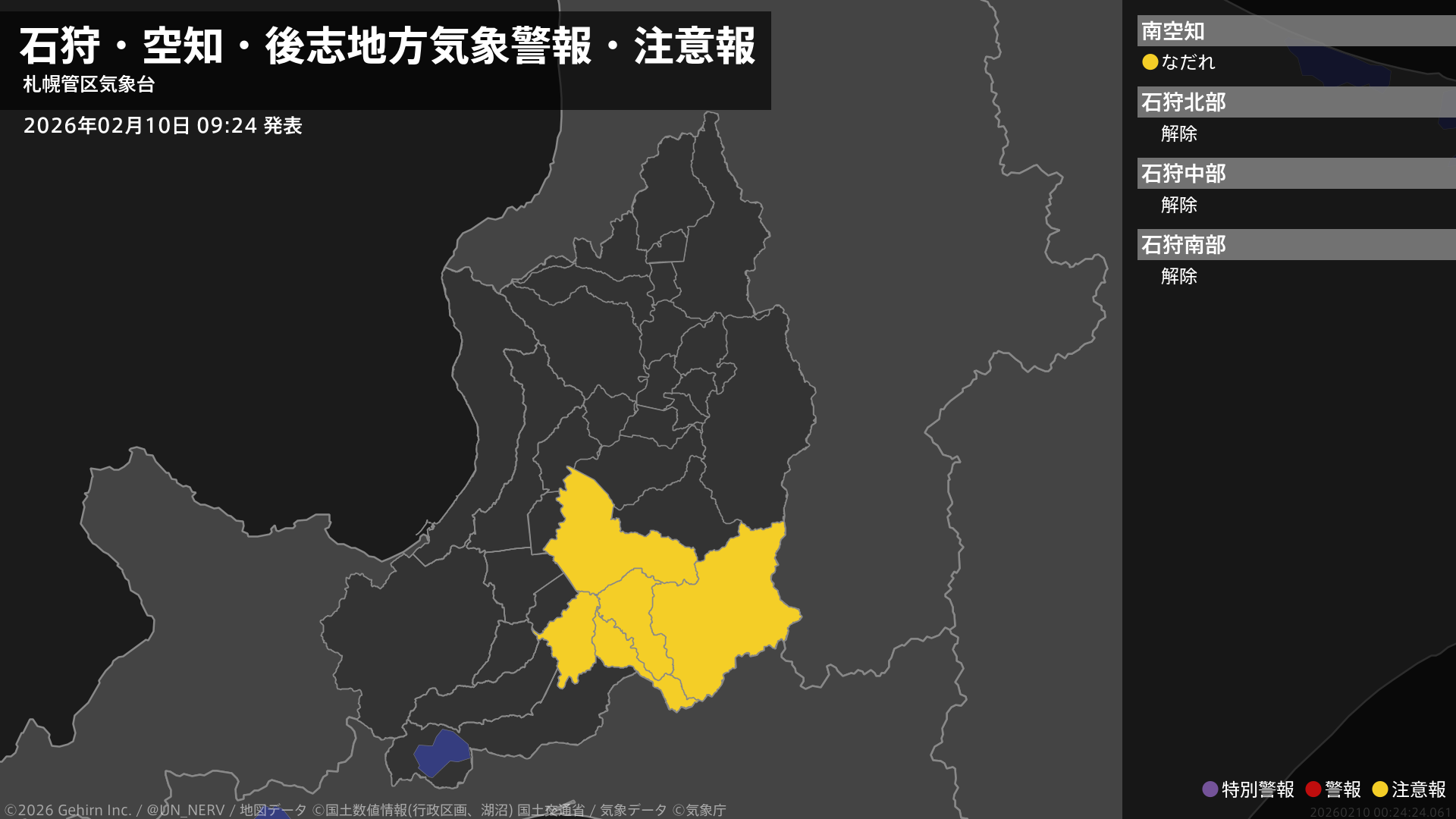【石狩・空知・後志地方 気象警報・注意報 2026年02月10日 09:24】空知地方では、11日までなだれに注意してください。#気象警報注意報 #石狩地方 #空知地方