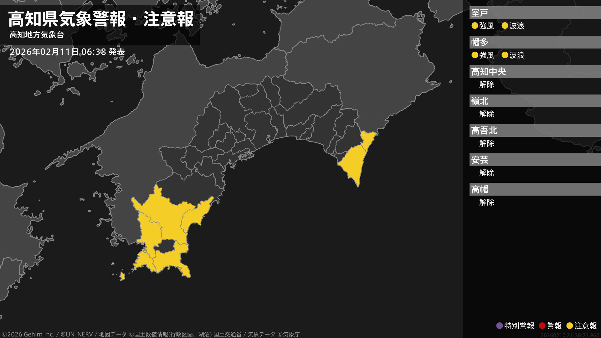 【高知県 気象警報・注意報 2026年02月11日 06:38】東部では11日夕方まで、西部では11日夜のはじめ頃まで、強風に注意してください。東部、西部では、11日夕方まで高波に注意してください。#気象警報注意報 #高知県