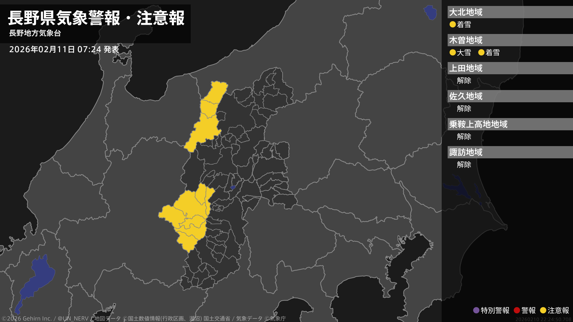 【長野県 気象警報・注意報 2026年02月11日 07:24】南部では、11日昼前まで大雪に注意してください。北部、南部では、11日昼前まで電線等への着雪に注意してください。#気象警報注意報 #長野県