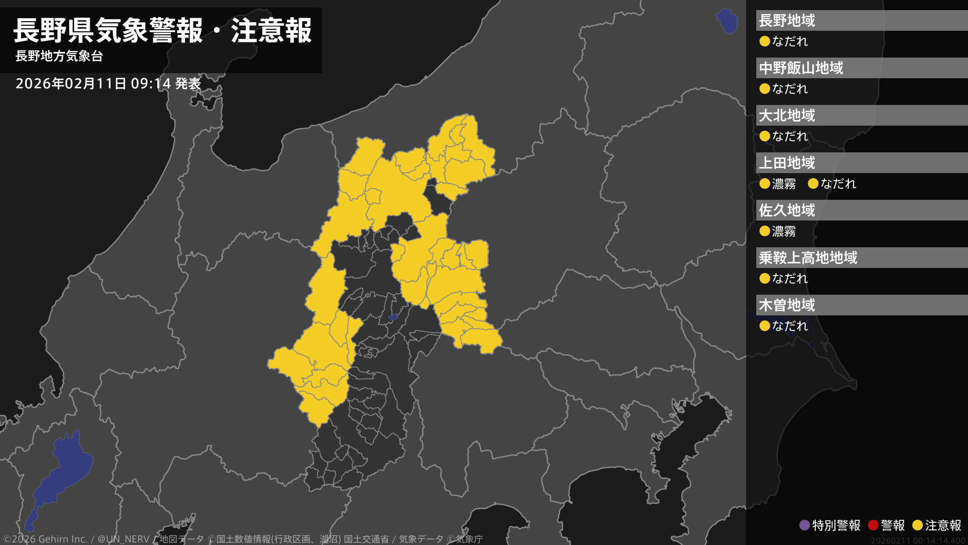 【長野県 気象警報・注意報 2026年02月11日 09:14】中部では、11日夕方まで濃霧による視程障害に注意してください。長野県では、11日までなだれに注意してください。#気象警報注意報 #長野県