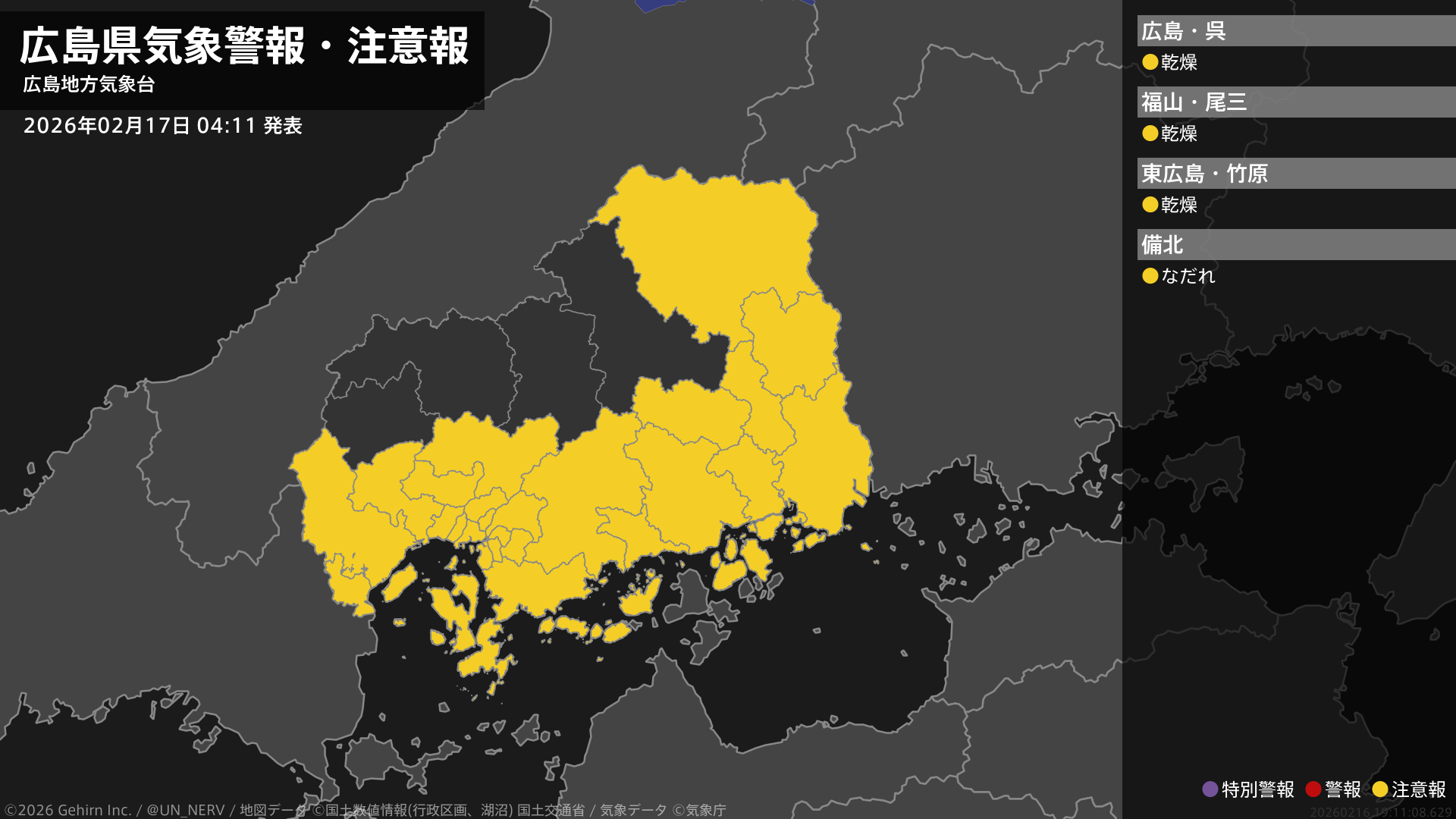 【広島県 気象警報・注意報 2026年02月17日 04:11】南部では、18日まで空気の乾燥した状態が続くため、火の取り扱いに注意してください。北部では、18日までなだれに注意してください。#気象警報注意報 #広島県