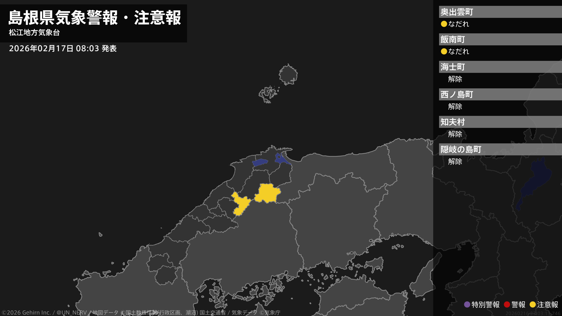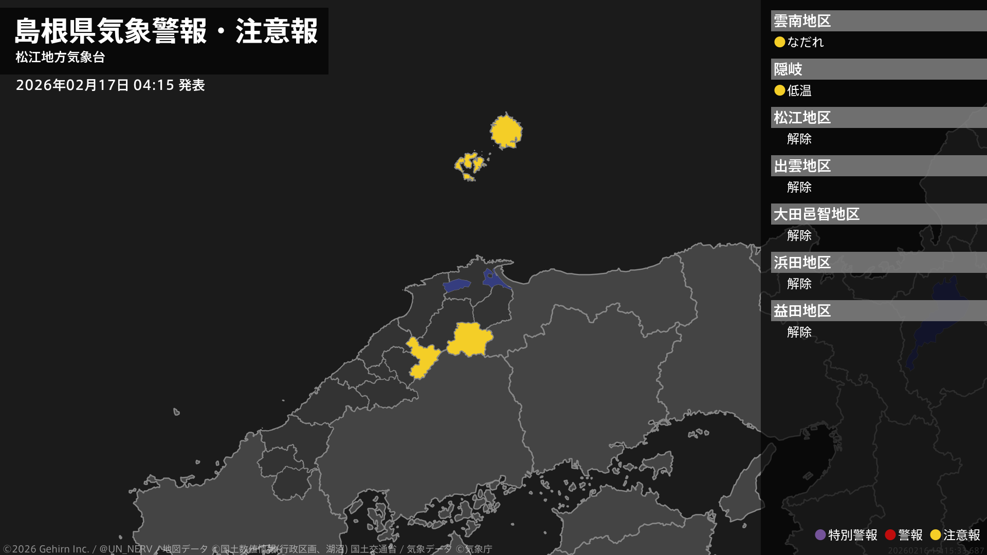 【島根県 気象警報・注意報 2026年02月17日 04:15】東部では、18日までなだれに注意してください。隠岐では、17日まで低温に注意してください。#気象警報注意報 #島根県
