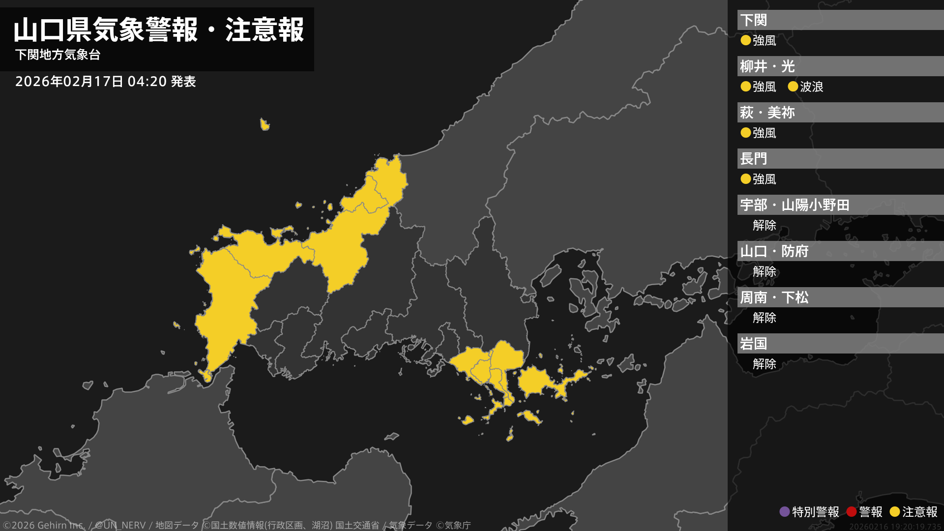 【山口県 気象警報・注意報 2026年02月17日 04:20】西部、東部、北部では、17日昼前まで強風に注意してください。東部では、17日昼前まで高波に注意してください。#気象警報注意報 #山口県