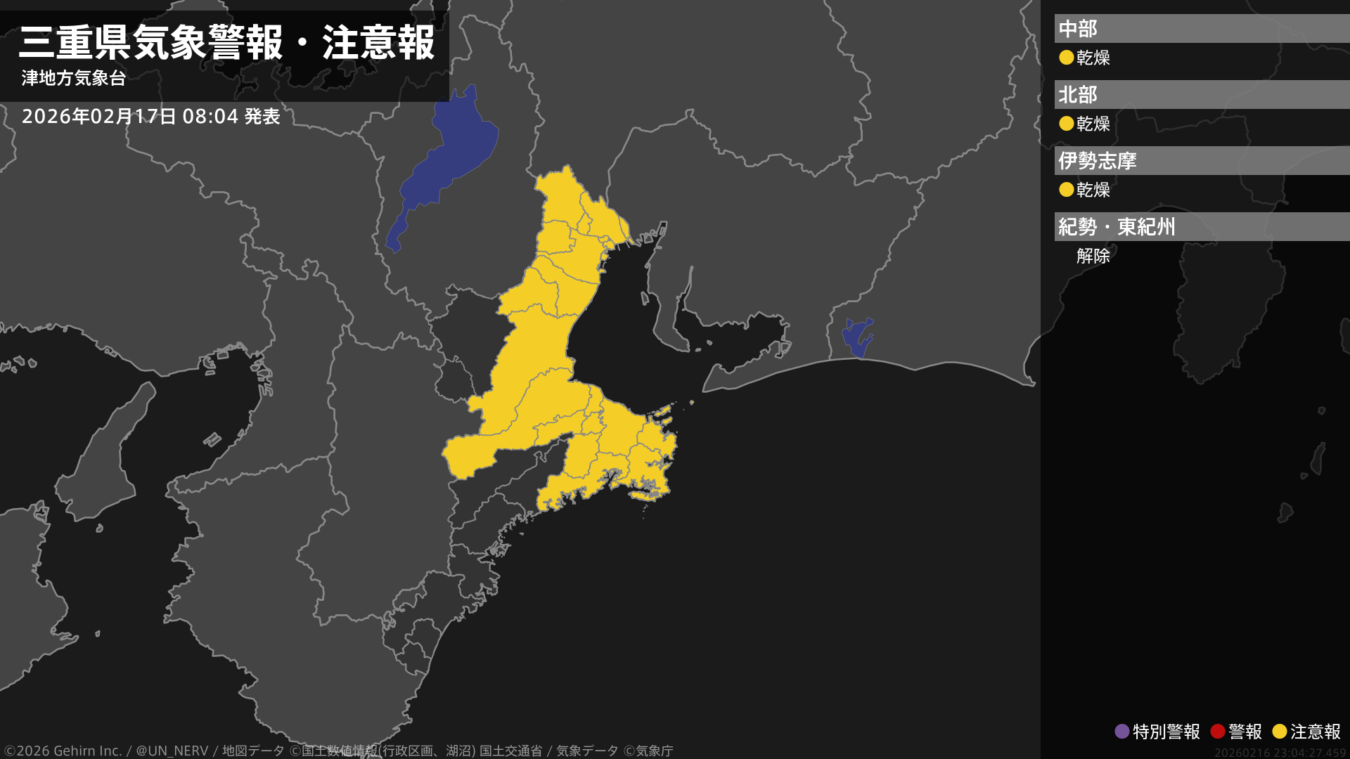 【三重県 気象警報・注意報 2026年02月17日 04:27】南部では、17日朝まで強風に注意してください。三重県では、18日まで空気の乾燥した状態が続くため、火の取り扱いに注意してください。#気象警報注意報 #三重県