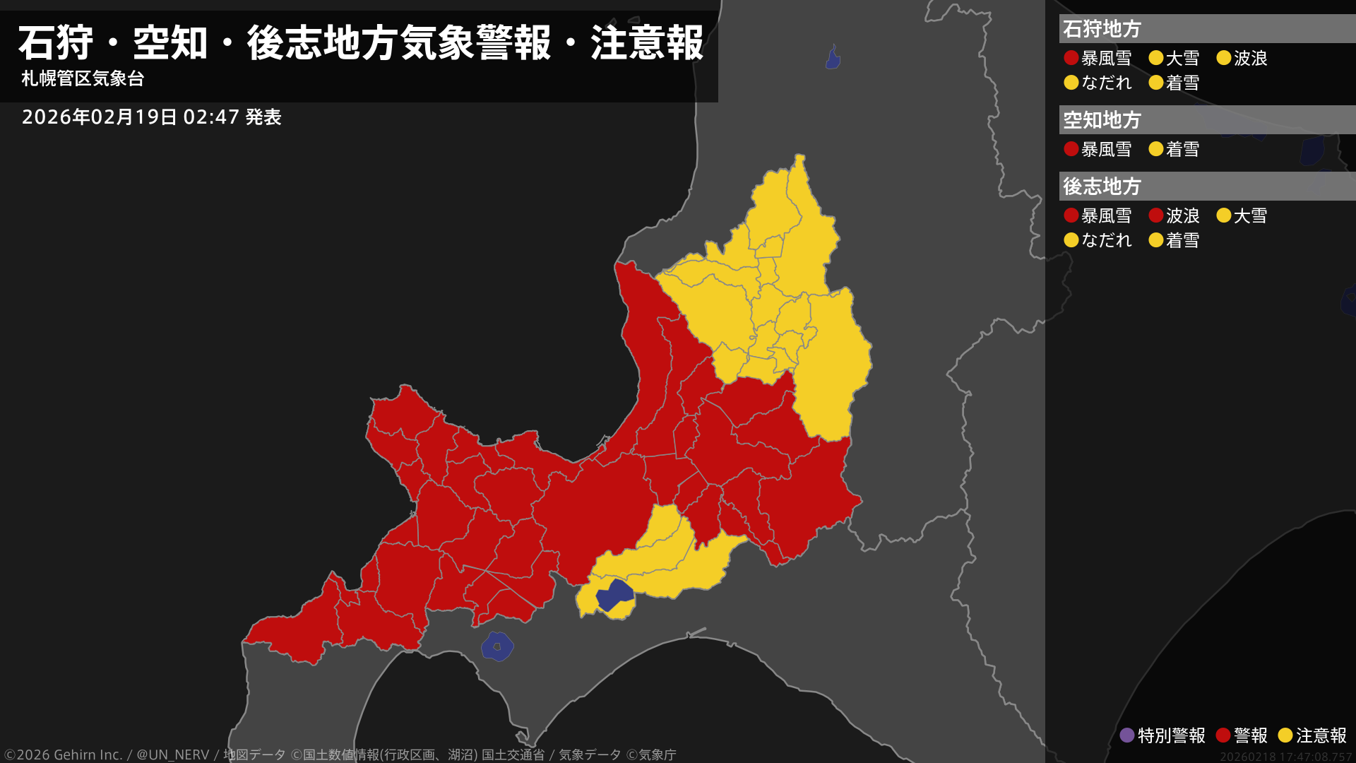 【石狩・空知・後志地方 気象警報・注意報 2026年02月19日 02:47】