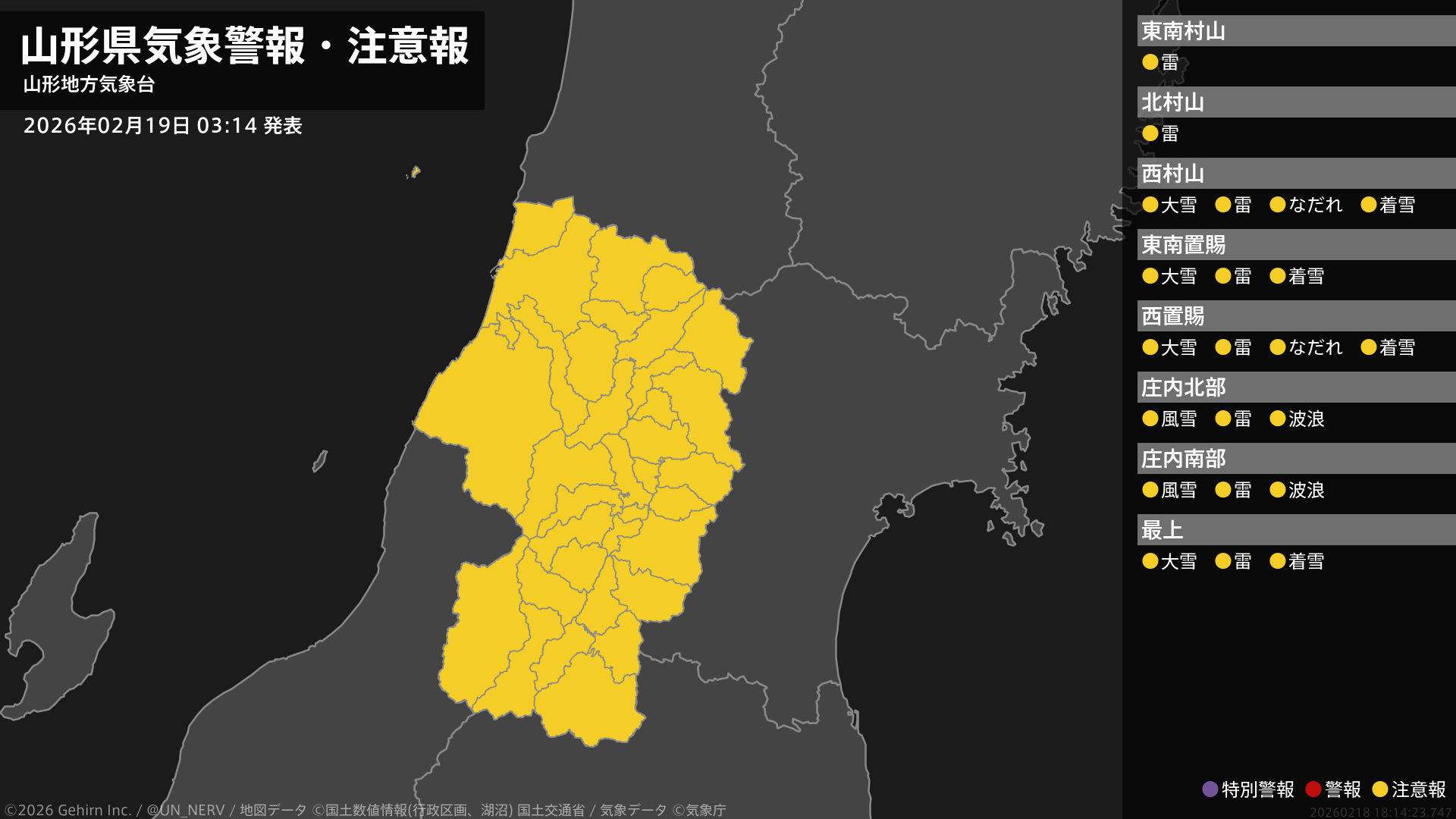 【山形県 気象警報・注意報 2026年02月19日 03:14】
