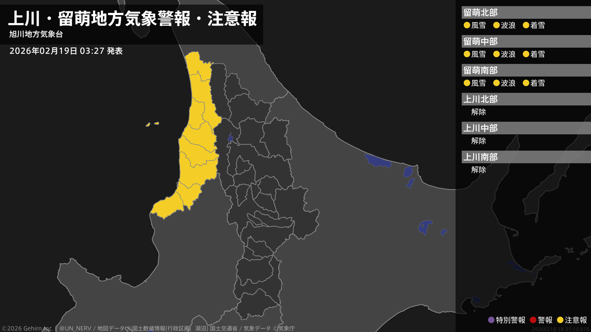【上川・留萌地方 気象警報・注意報 2026年02月19日 03:27】