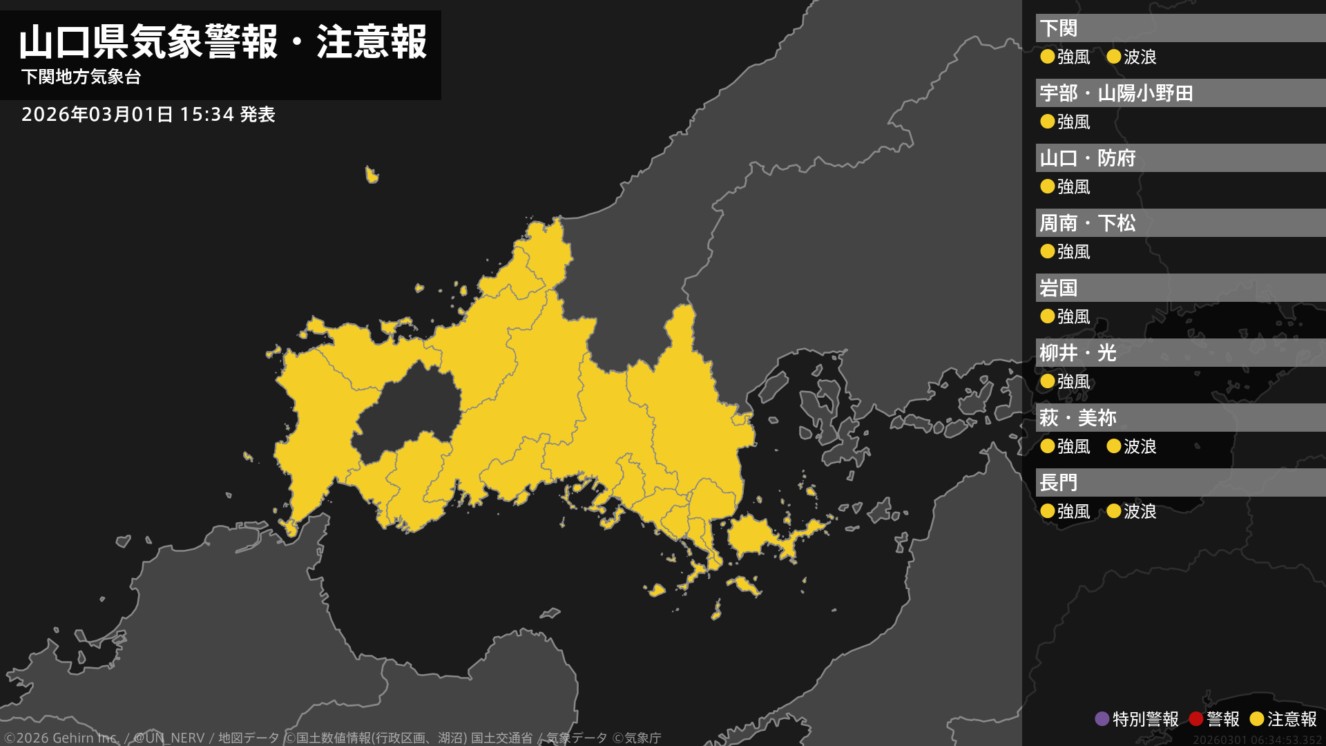 【山口県 気象警報・注意報 2026年03月01日 15:34】