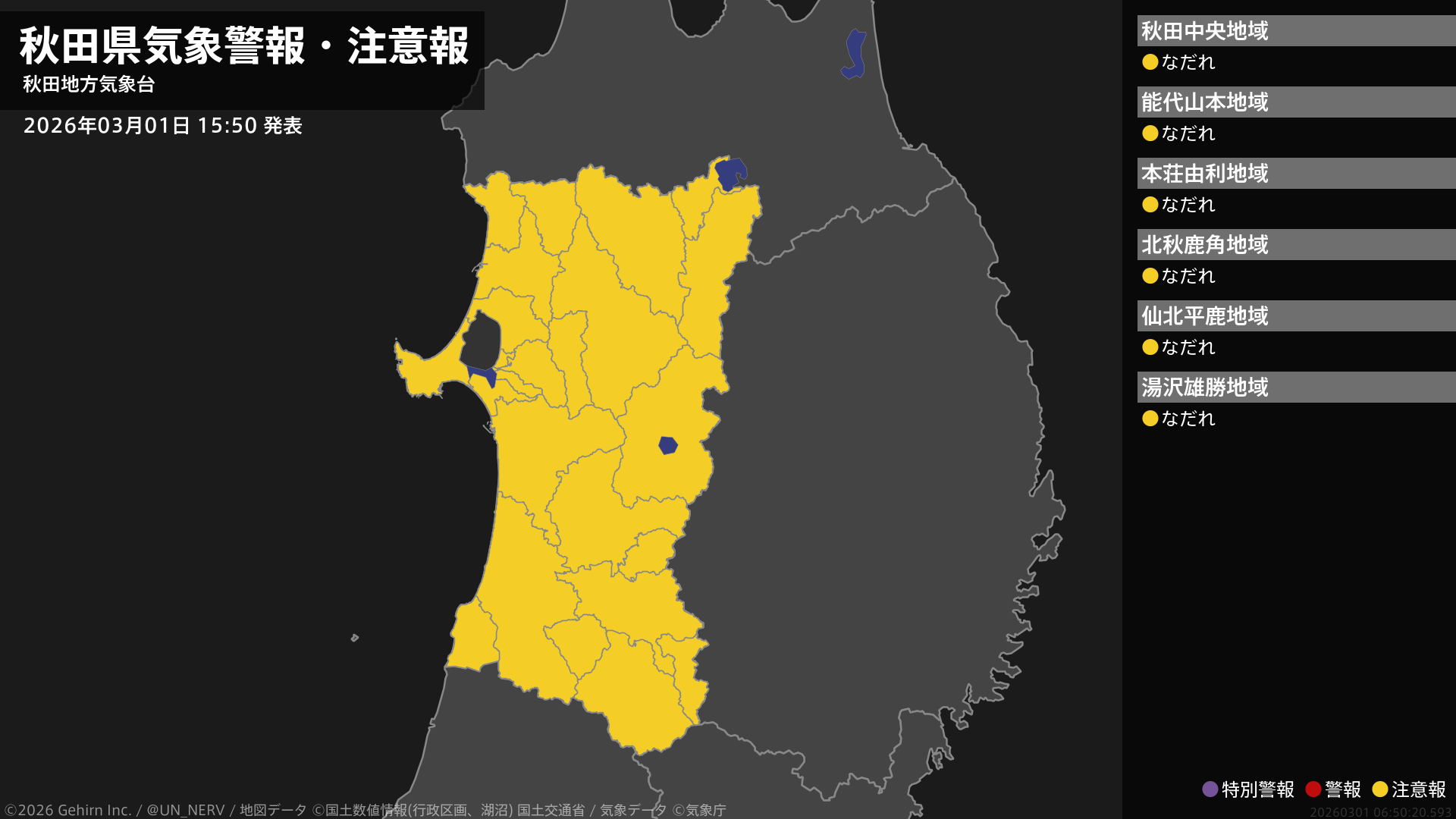 【秋田県 気象警報・注意報 2026年03月01日 15:50】