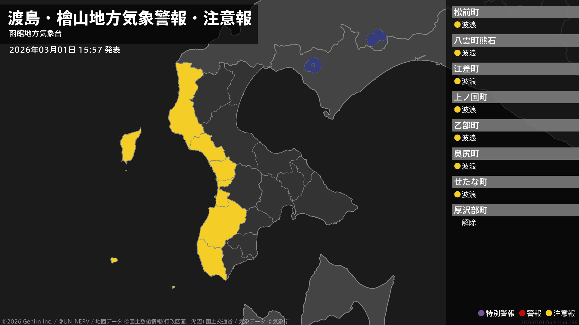 【渡島・檜山地方 気象警報・注意報 2026年03月01日 15:57】