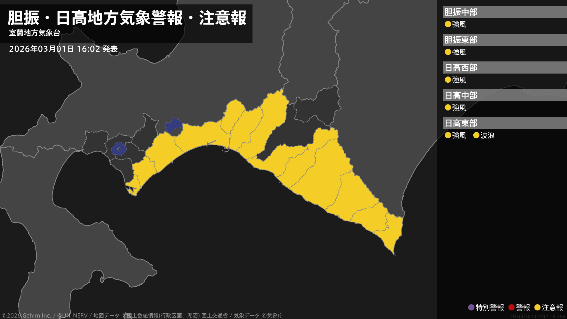 【胆振・日高地方 気象警報・注意報 2026年03月01日 16:02】