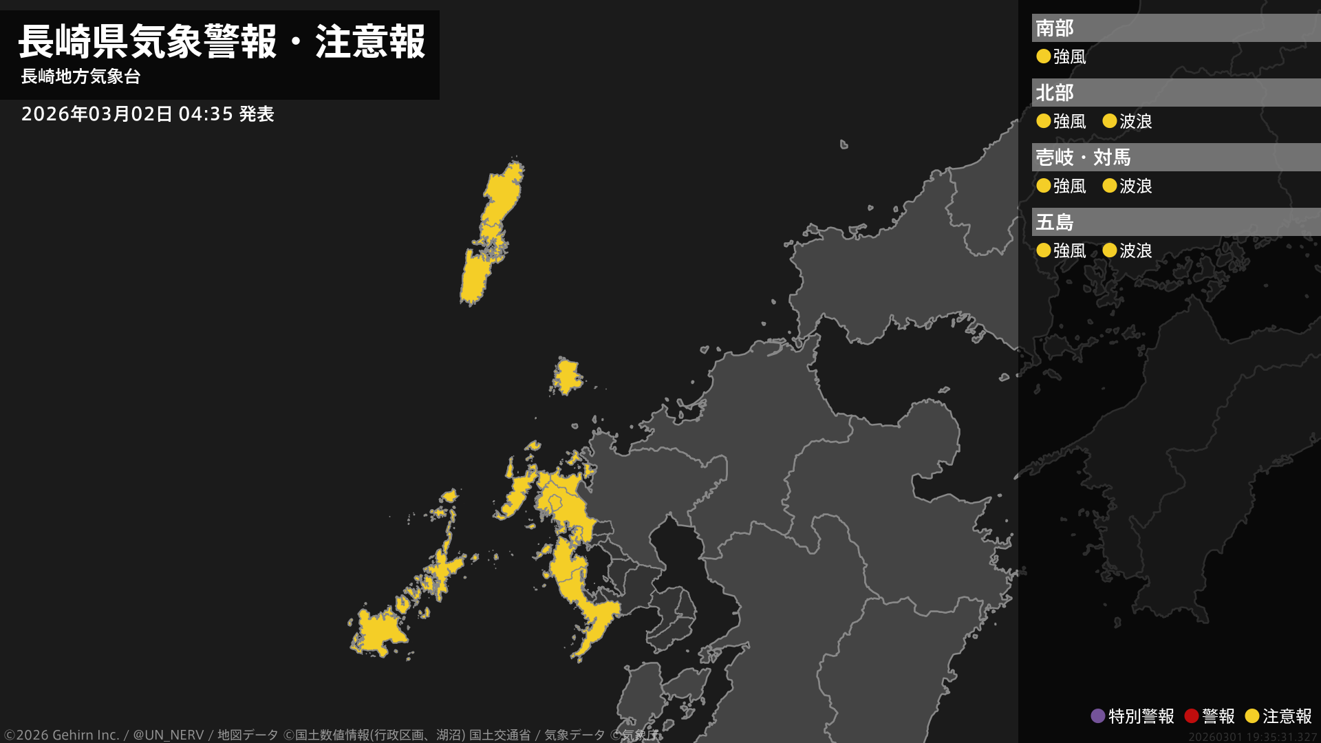 【長崎県 気象警報・注意報 2026年03月02日 04:35】長崎県では、強風に注意してください。北部、壱岐・対馬、五島では、高波に注意してください。#気象警報注意報 #長崎県