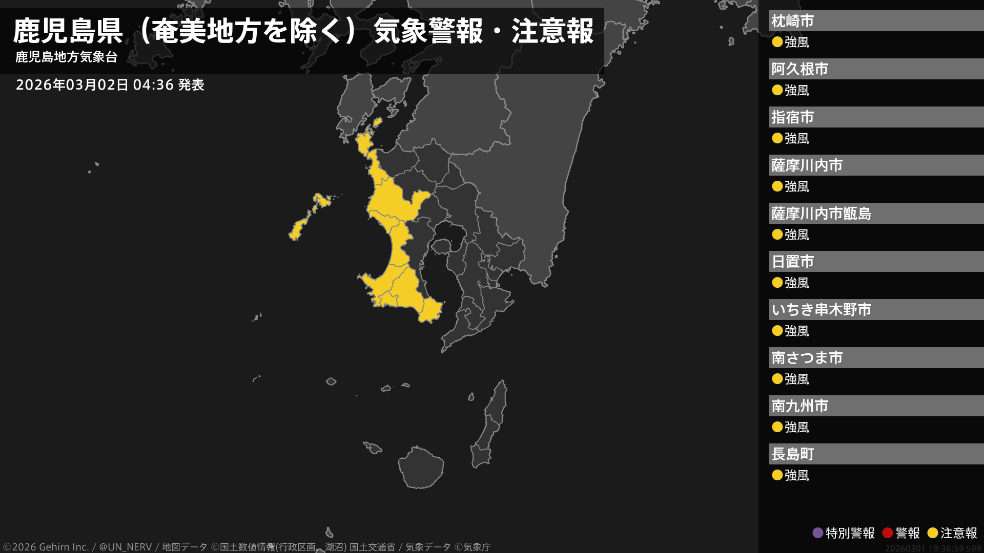 【鹿児島県(奄美地方を除く) 気象警報・注意報 2026年03月02日 04:37】薩摩地方では、2日昼前から強風に注意してください。#気象警報注意報 #鹿児島県(奄美地方除く)