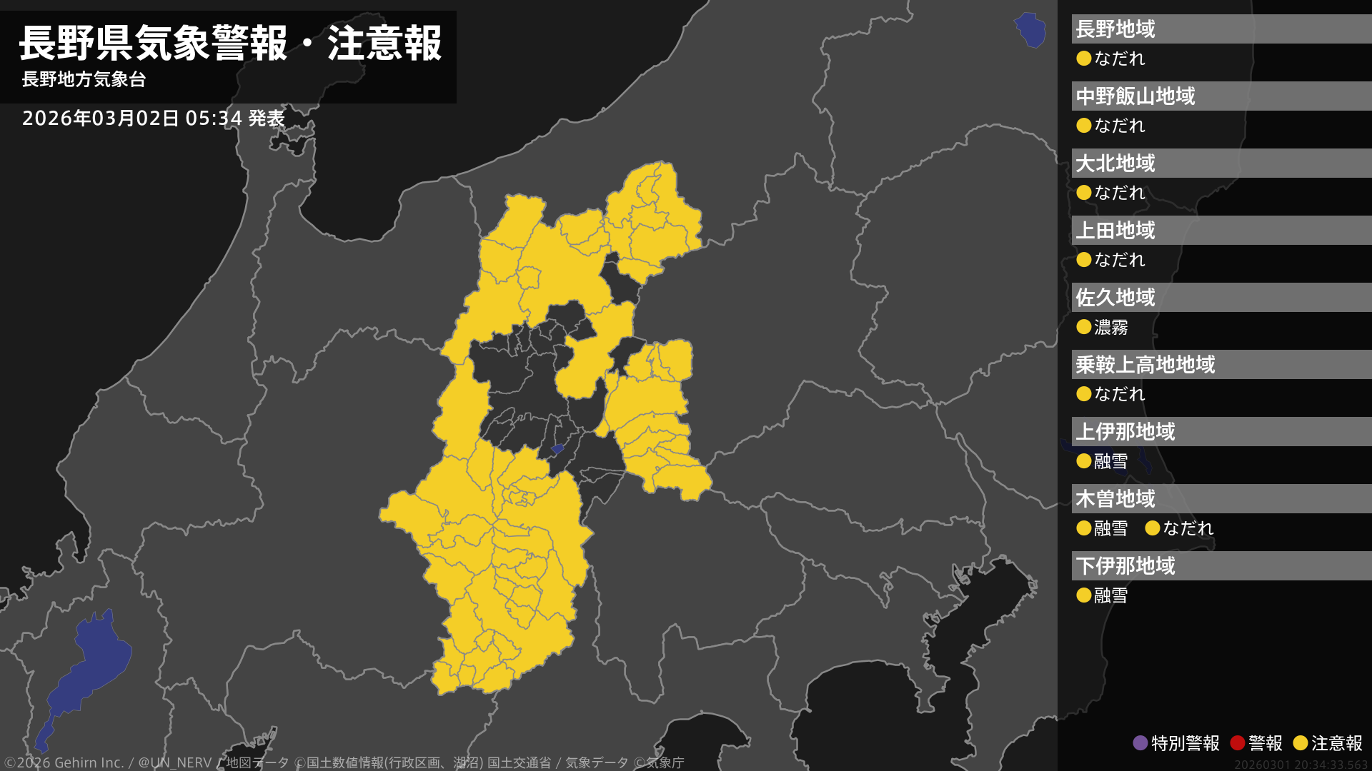 【長野県 気象警報・注意報 2026年03月02日 05:34】南部では、2日夜遅くまで融雪による土砂災害に注意してください。中部では、2日昼前まで濃霧による視程障害に注意してください。長野県では、2日までなだれに注意してください。#気象警報注意報 #長野県