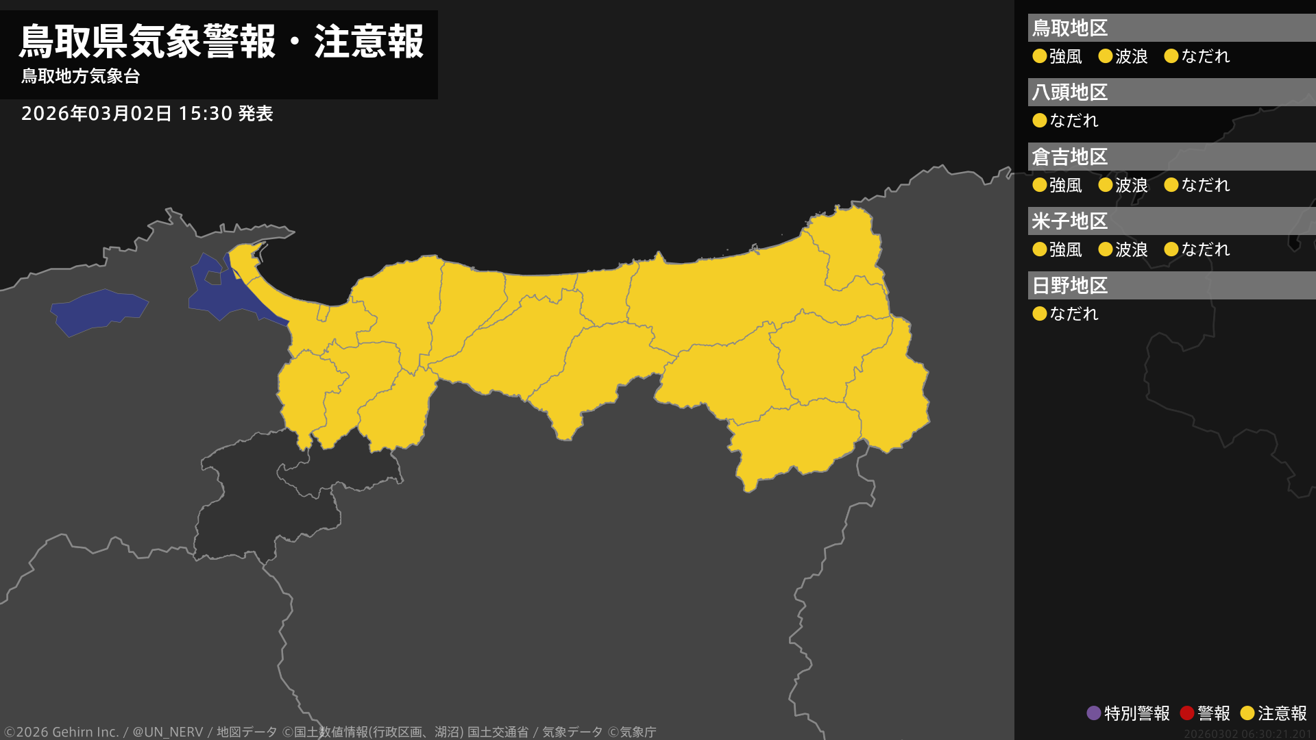 【鳥取県 気象警報・注意報 2026年03月02日 15:30】鳥取県では、3日未明から強風や高波に、4日までなだれに注意してください。#気象警報注意報 #鳥取県