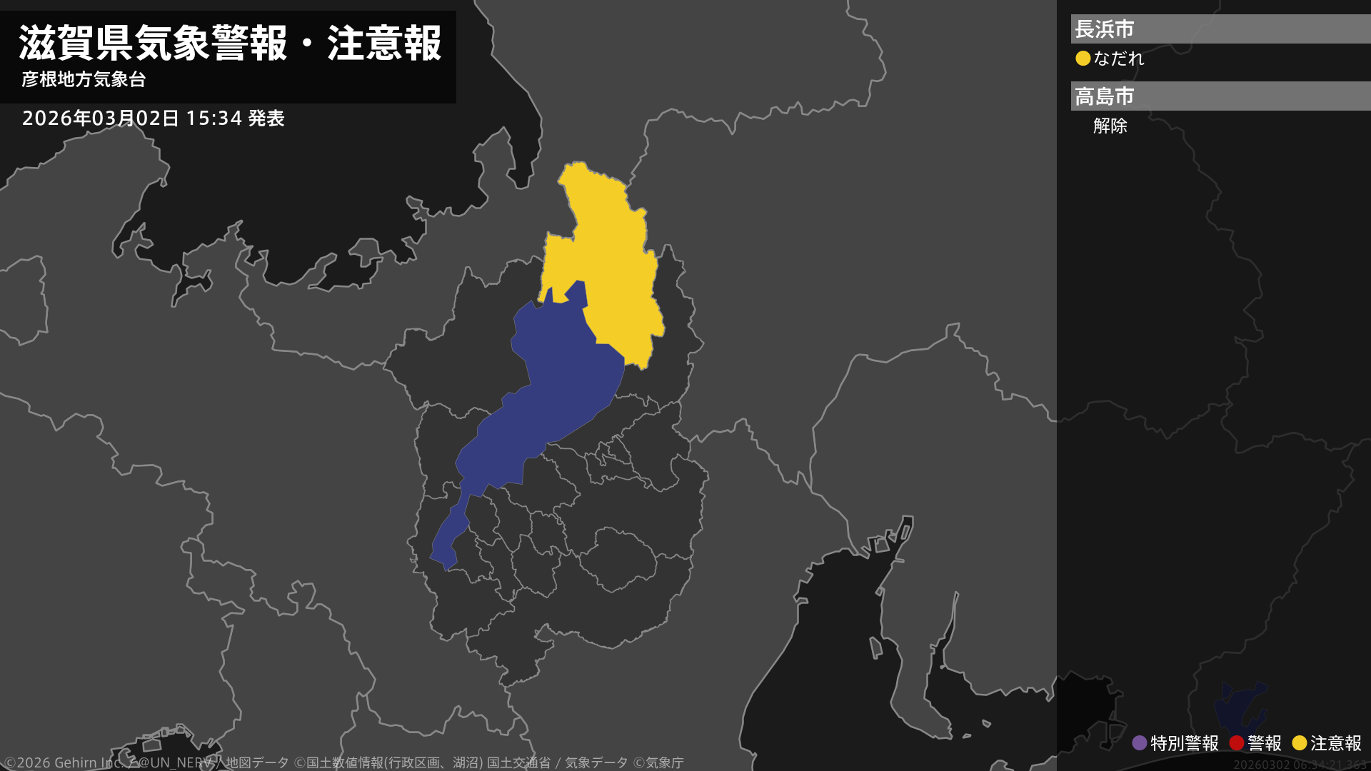 【滋賀県 気象警報・注意報 2026年03月02日 15:34】北部では、4日までなだれに注意してください。#気象警報注意報 #滋賀県