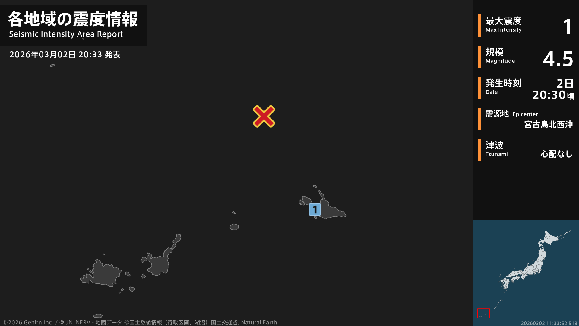 20時30分頃、宮古島北西沖を震源とする地震がありました。震源の深さは約10km、地震の規模はM4.5、最大震度1を沖縄県で観測しています。この地震による津波の心配はありません。