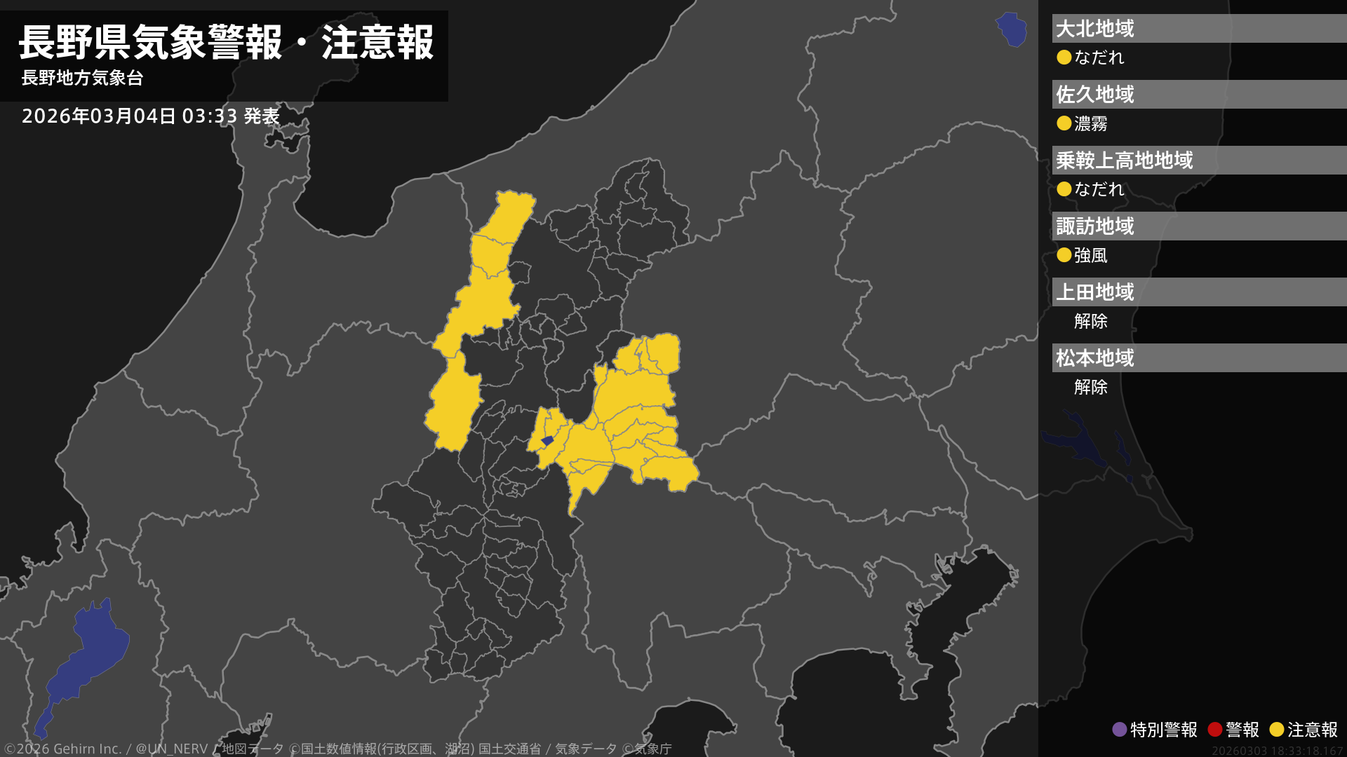 【長野県 気象警報・注意報 2026年03月04日 03:33】中部では、4日昼過ぎから4日夕方まで強風に、4日昼前まで濃霧による視程障害に注意してください。北部、中部では、4日までなだれに注意してください。#気象警報注意報 #長野県