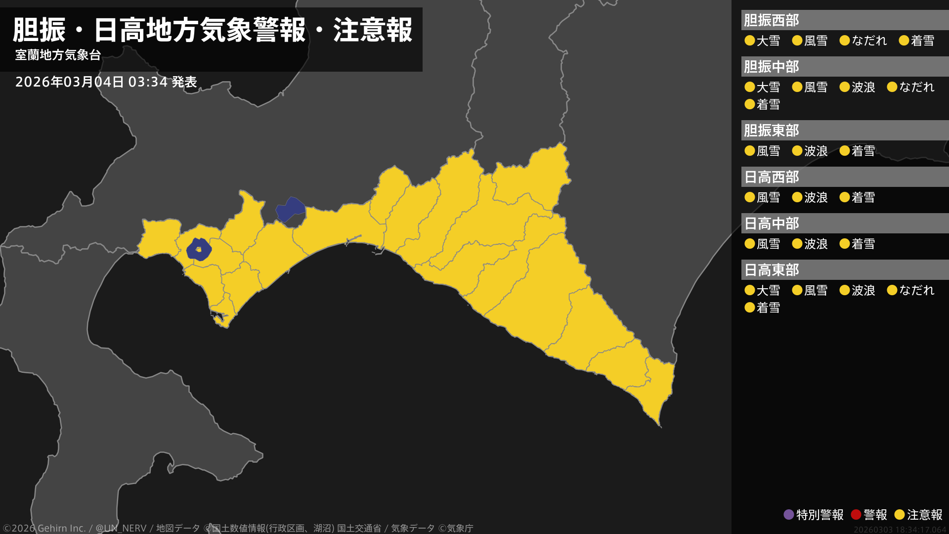 【胆振・日高地方 気象警報・注意報 2026年03月04日 03:34】胆振、日高地方では、風雪や大雪、高波、なだれ、電線等への着雪に注意してください。#気象警報注意報 #胆振地方 #日高地方