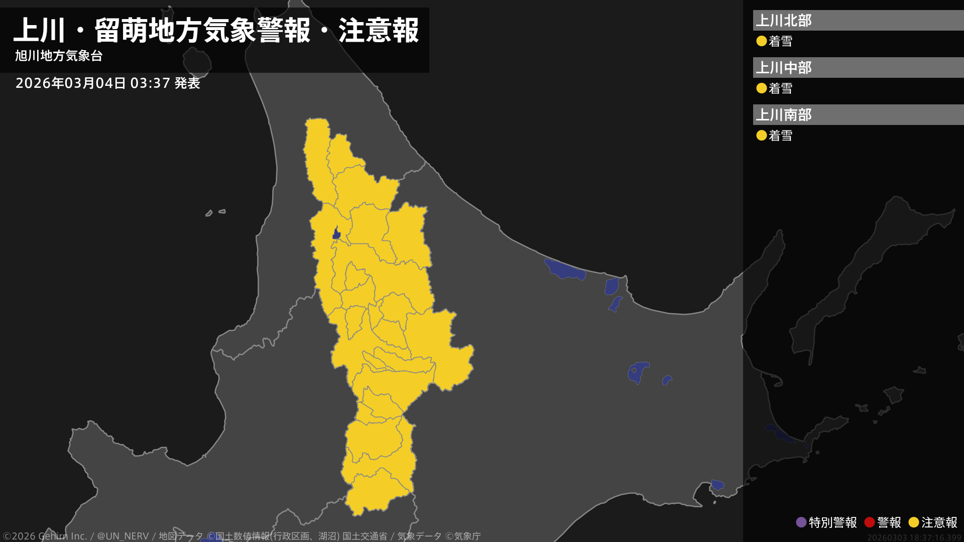 【上川・留萌地方 気象警報・注意報 2026年03月04日 03:37】上川地方では、4日朝から4日夜遅くまで電線等への着雪に注意してください。#気象警報注意報 #上川地方