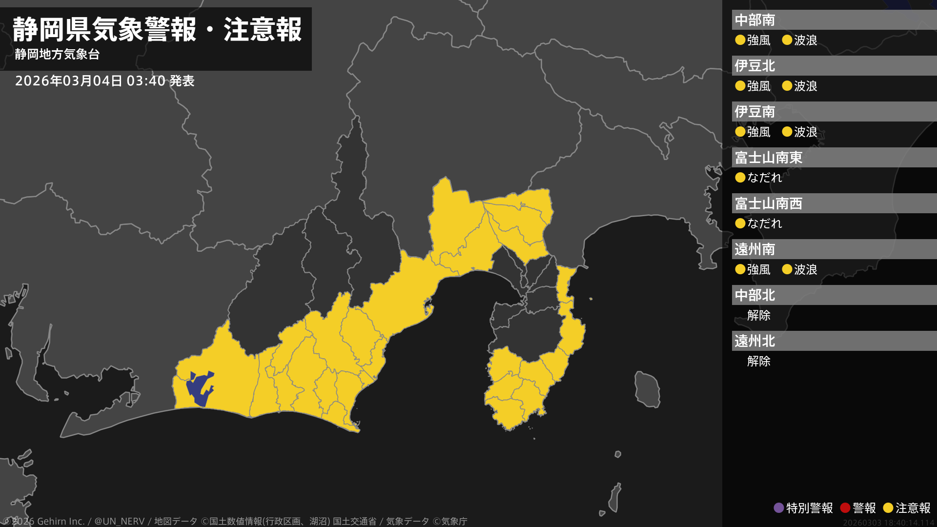 【静岡県 気象警報・注意報 2026年03月04日 03:40】中部、伊豆、西部では、強風や高波に注意してください。東部では、なだれに注意してください。#気象警報注意報 #静岡県