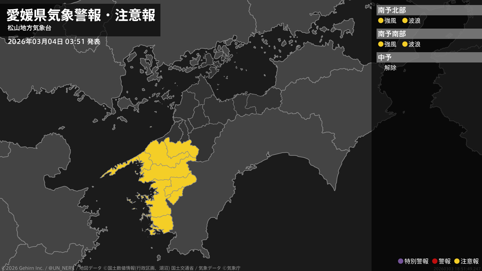 【愛媛県 気象警報・注意報 2026年03月04日 03:51】南予では、4日夜のはじめ頃まで強風や高波に注意してください。#気象警報注意報 #愛媛県