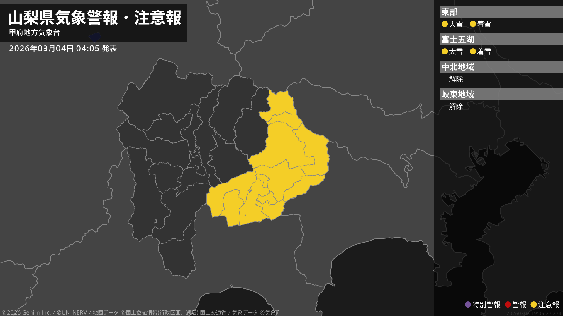 【山梨県 気象警報・注意報 2026年03月04日 04:05】東部・富士五湖では、4日明け方まで大雪や電線等への着雪に注意してください。#気象警報注意報 #山梨県
