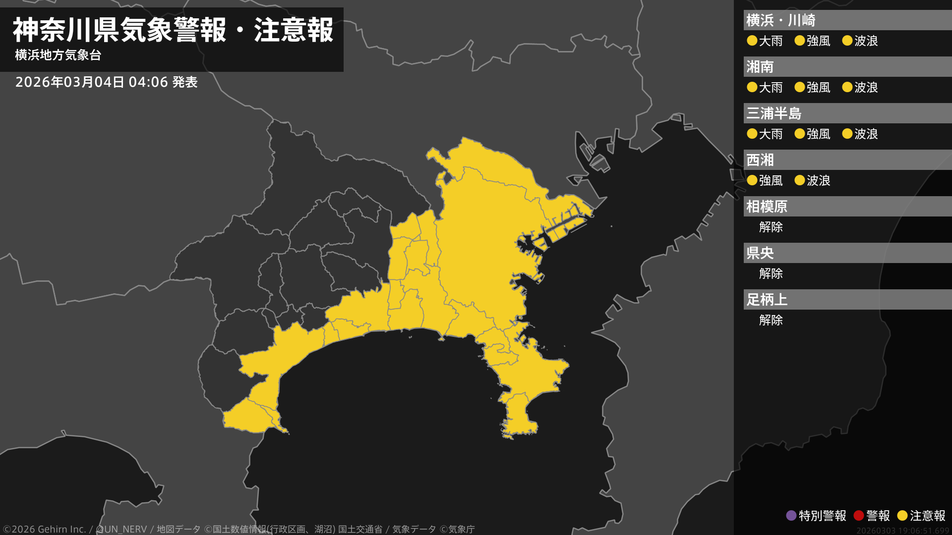 【神奈川県 気象警報・注意報 2026年03月04日 04:06】東部では、土砂災害に注意してください。神奈川県では、強風や高波に注意してください。#気象警報注意報 #神奈川県