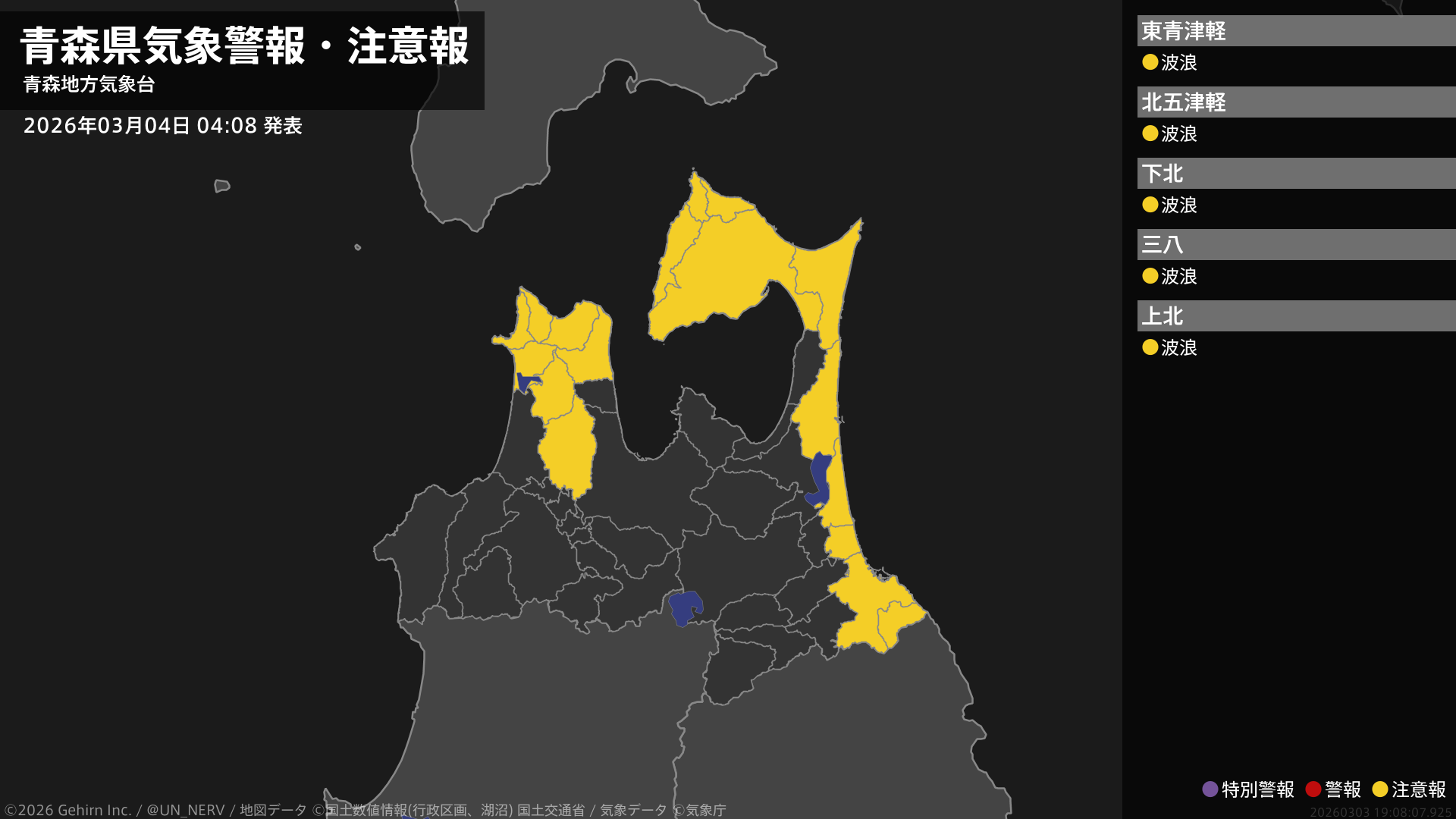 【青森県 気象警報・注意報 2026年03月04日 04:08】青森県では、高波に注意してください。#気象警報注意報 #青森県