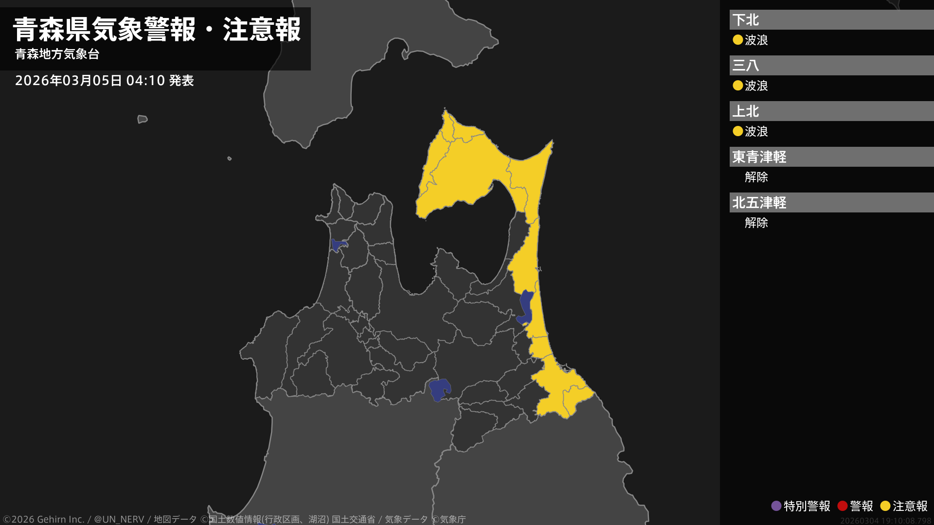 【青森県 気象警報・注意報 2026年03月05日 04:10】下北、三八上北では、高波に注意してください。#気象警報注意報 #青森県