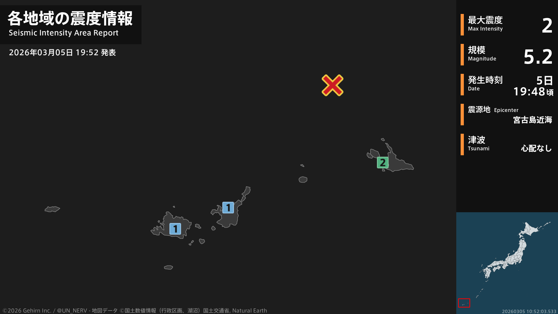 19時48分頃、宮古島近海を震源とする地震がありました。地震の規模はM4.8程度、最大震度2程度と推定されています。この情報は気象庁の予報に基づく推定です。情報は誤差を含む場合があります。