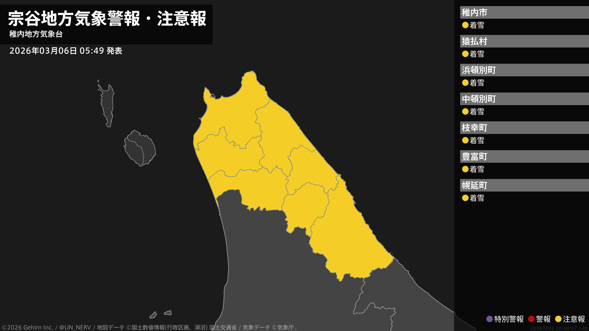 【宗谷地方 気象警報・注意報 2026年03月06日 05:49】宗谷地方では、6日昼前まで電線等への着雪に注意してください。#気象警報注意報 #宗谷地方