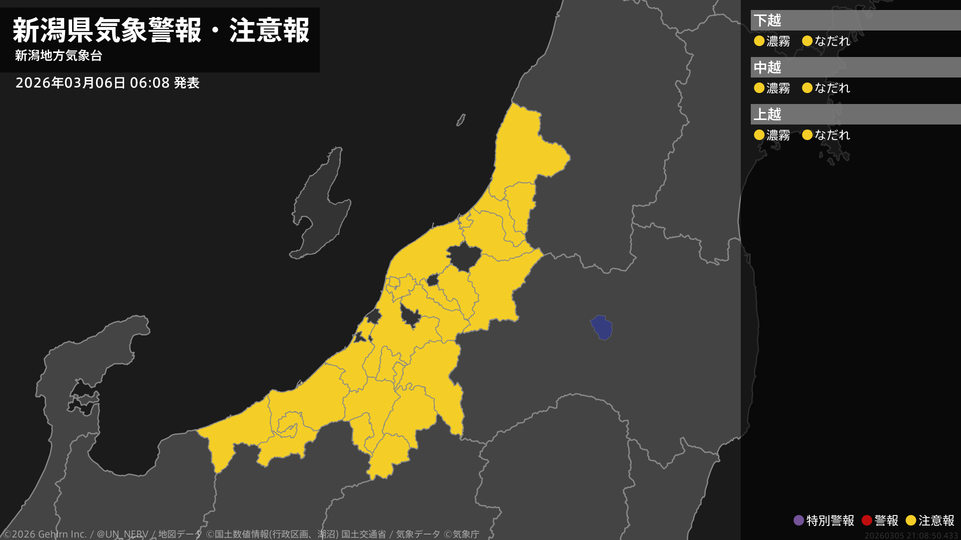 【新潟県 気象警報・注意報 2026年03月06日 06:08】下越、中越、上越では、6日昼前まで濃霧による視程障害に、6日までなだれに注意してください。#気象警報注意報 #新潟県