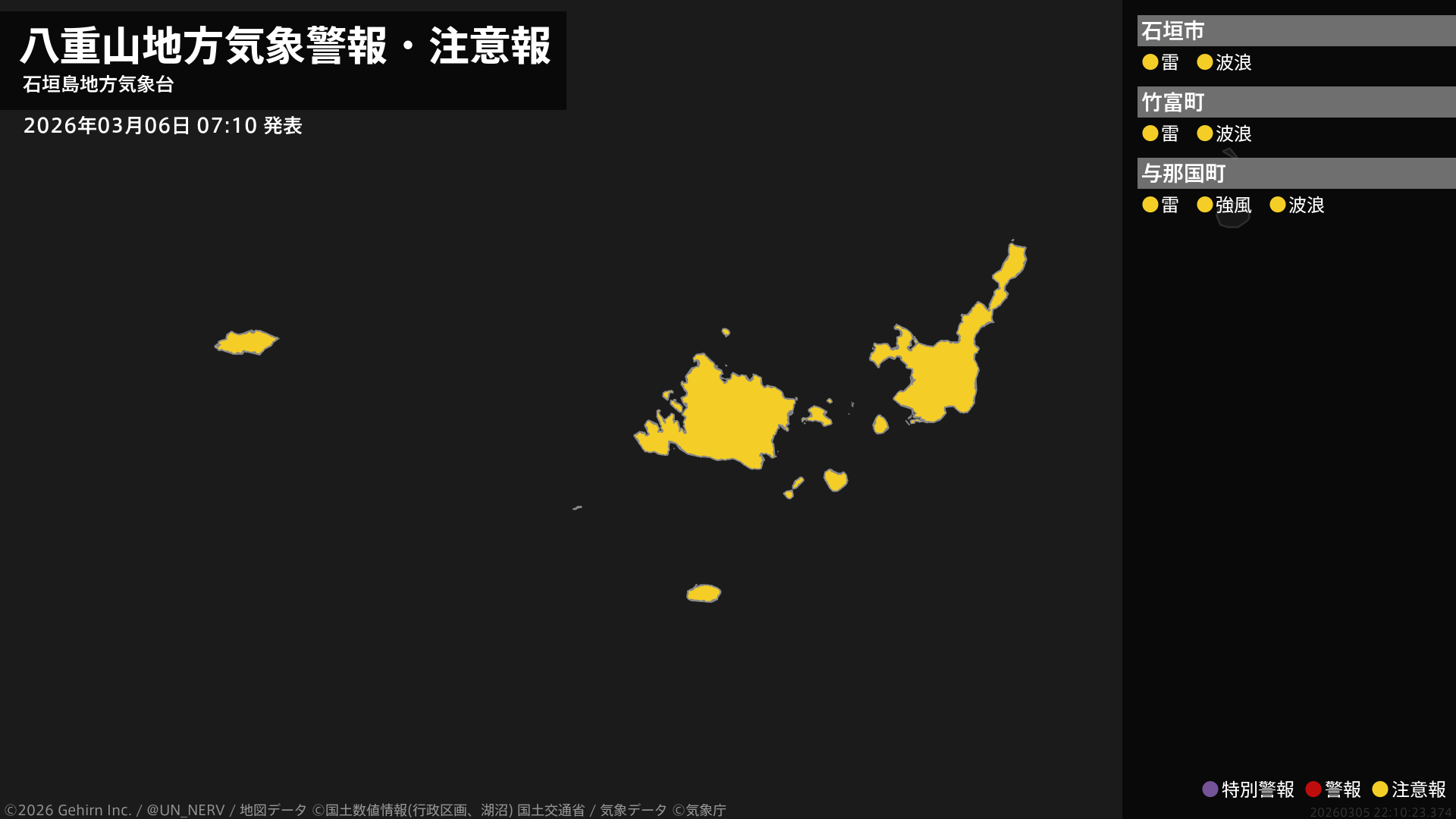 【八重山地方 気象警報・注意報 2026年03月06日 07:10】与那国島地方では、強風に注意してください。八重山地方では、高波や急な強い雨、落雷に注意してください。#気象警報注意報 #八重山地方