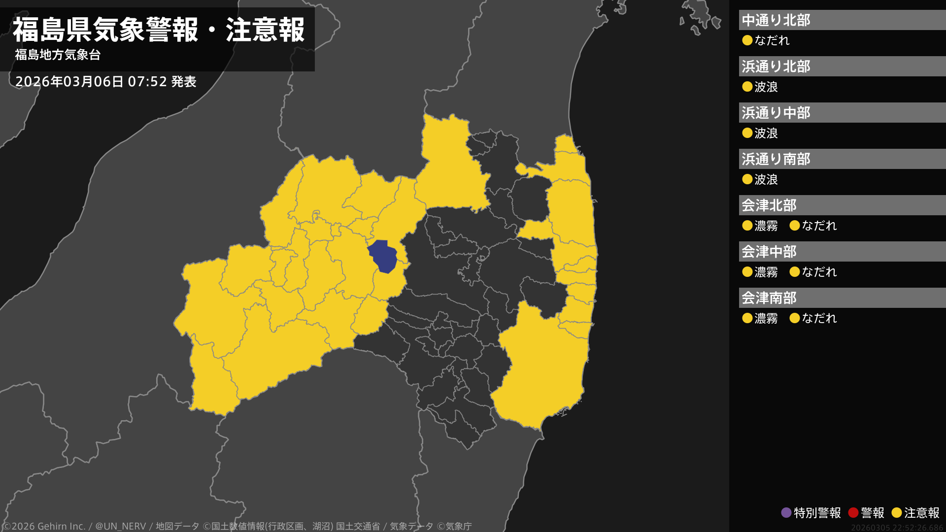 【福島県 気象警報・注意報 2026年03月06日 07:52】浜通りでは、高波に注意してください。会津では、濃霧による視程障害に注意してください。中通り、会津では、なだれに注意してください。#気象警報注意報 #福島県