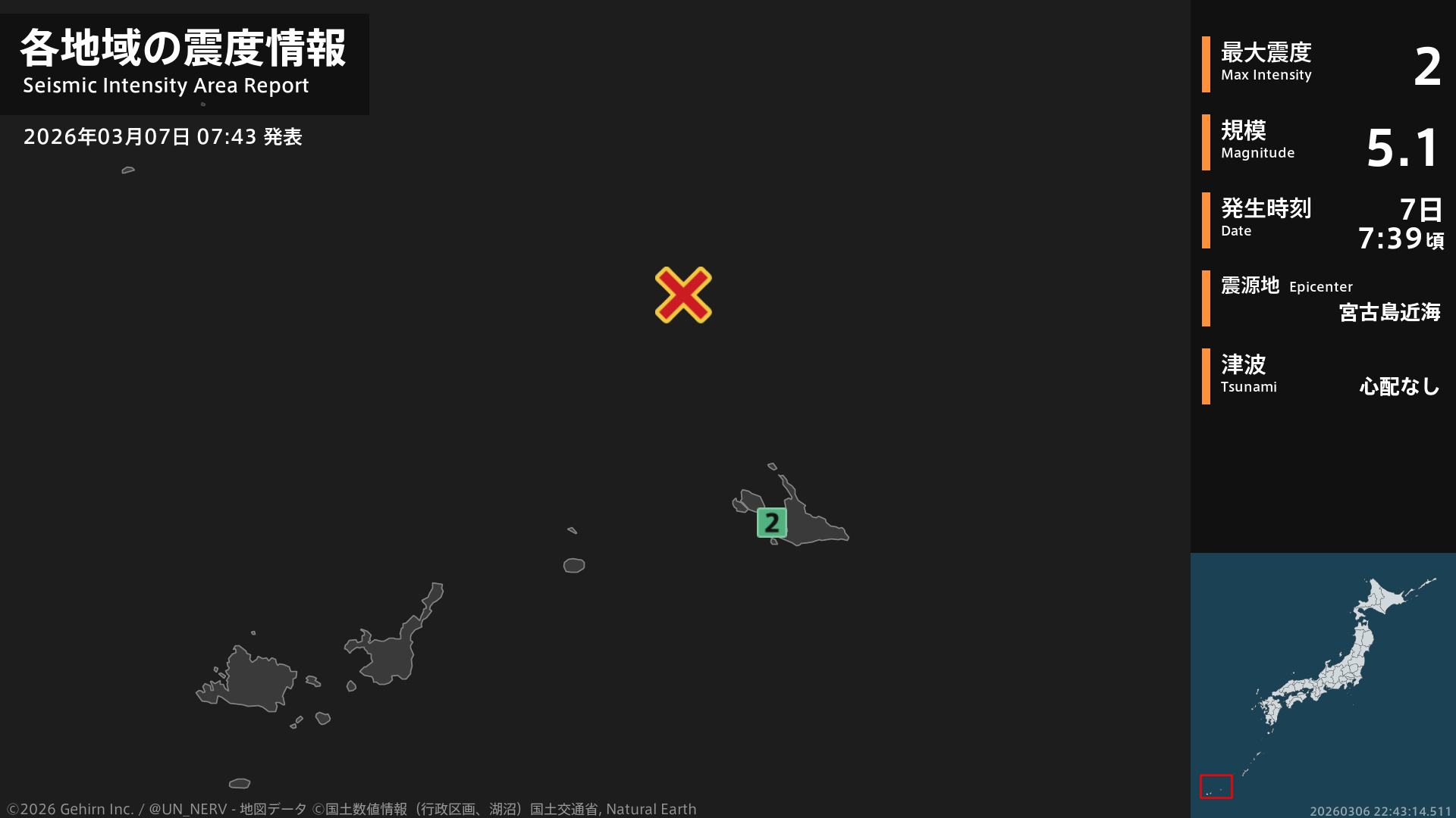 7時39分頃、宮古島北西沖を震源とする地震がありました。地震の規模はM5.2程度、最大震度3程度と推定されています。この情報は気象庁の予報に基づく推定です。情報は誤差を含む場合があります。