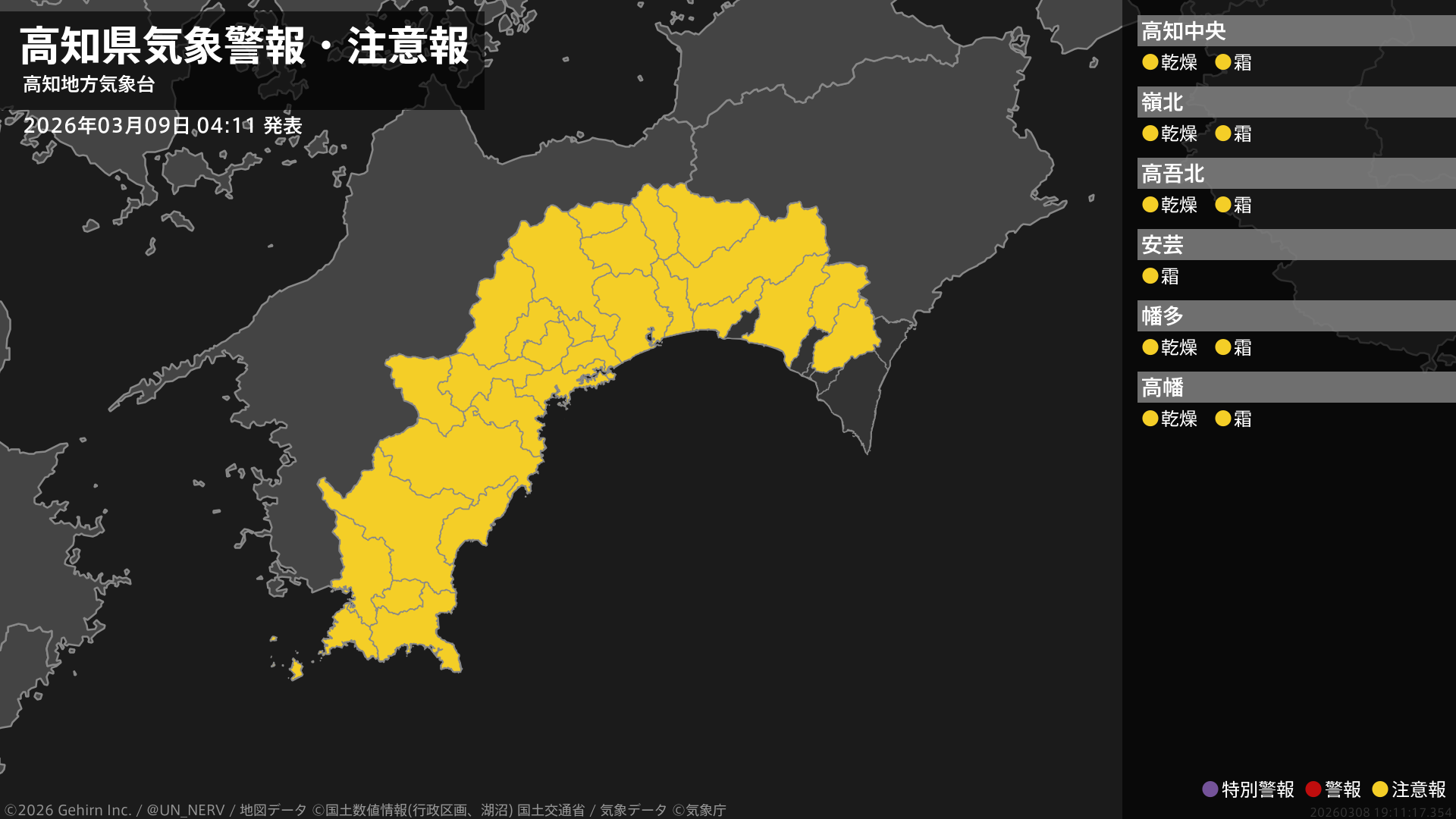 【高知県 気象警報・注意報 2026年03月09日 04:11】