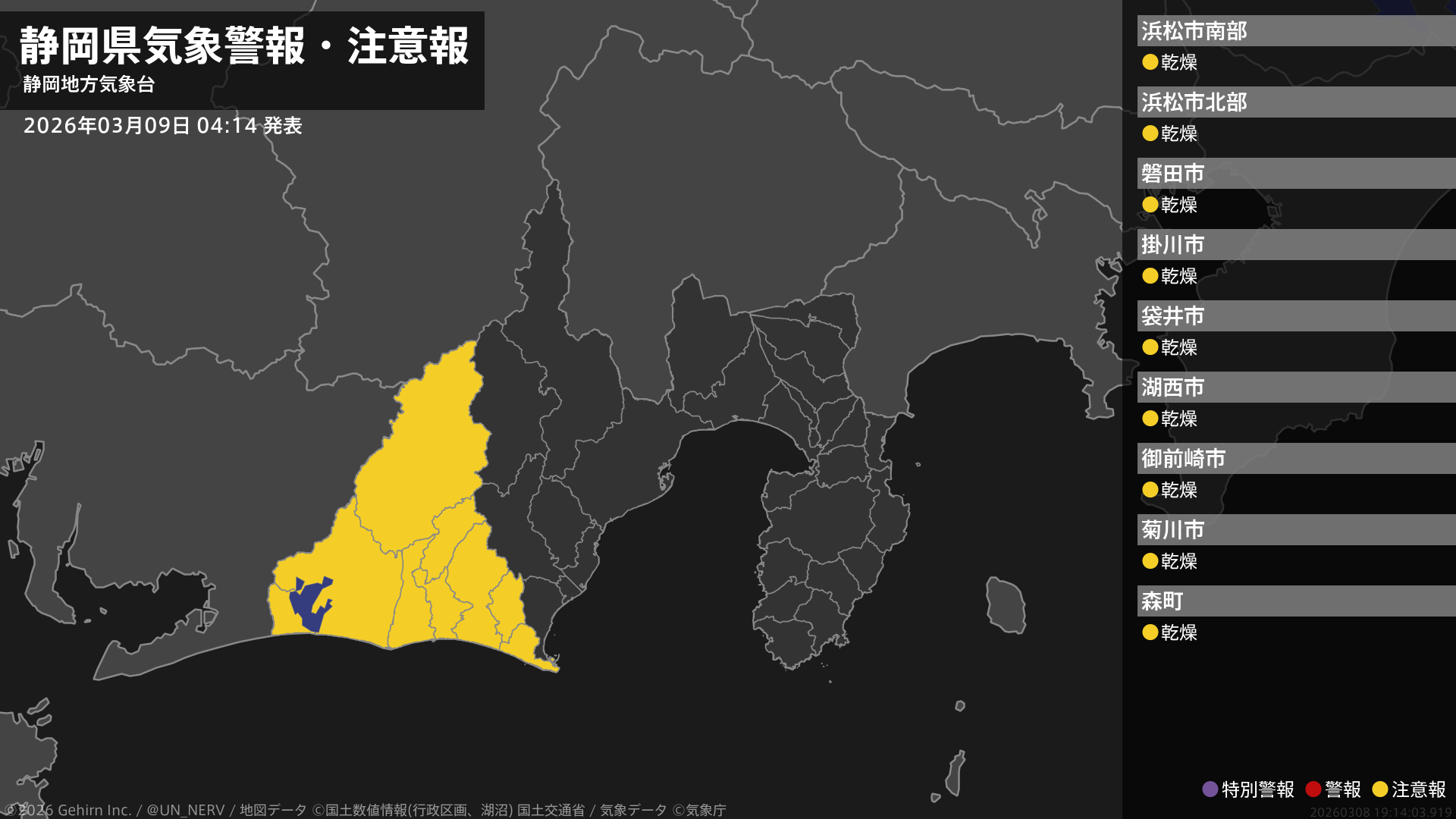 【静岡県 気象警報・注意報 2026年03月09日 04:14】