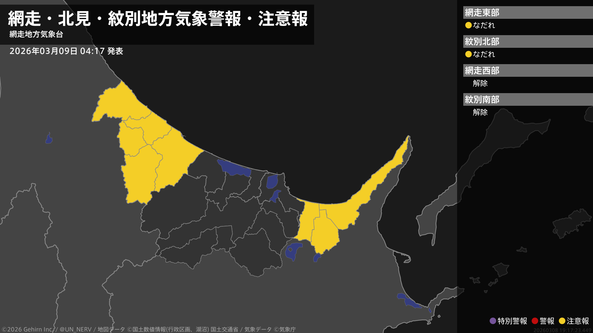 【網走・北見・紋別地方 気象警報・注意報 2026年03月09日 04:17】