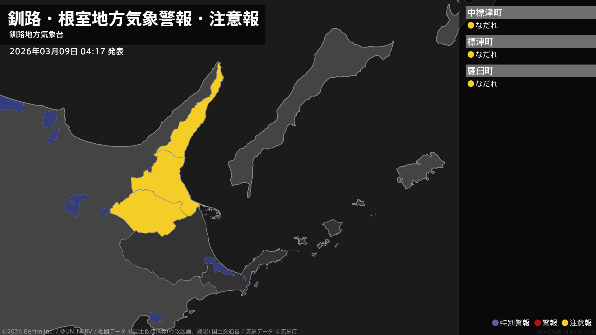 【釧路・根室地方 気象警報・注意報 2026年03月09日 04:17】
