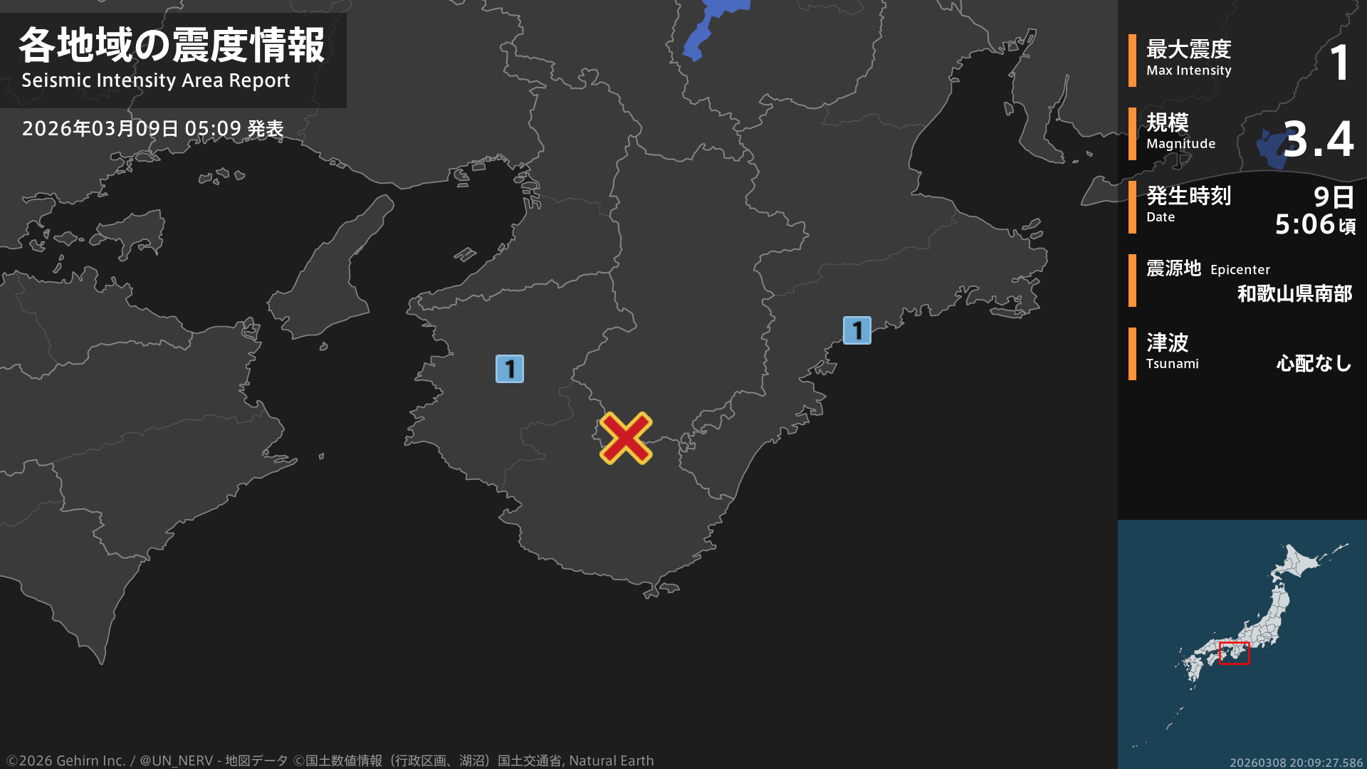 5時6分頃、和歌山県南部を震源とする地震がありました。震源の深さは約50km、地震の規模はM3.4、最大震度1を三重県、和歌山県で観測しています。この地震による津波の心配はありません。