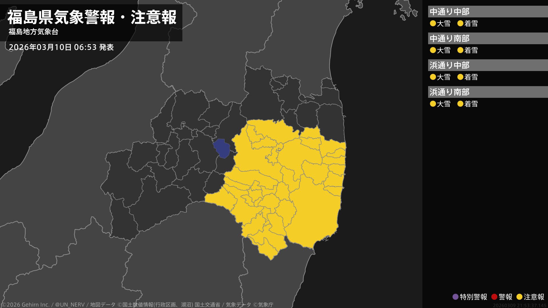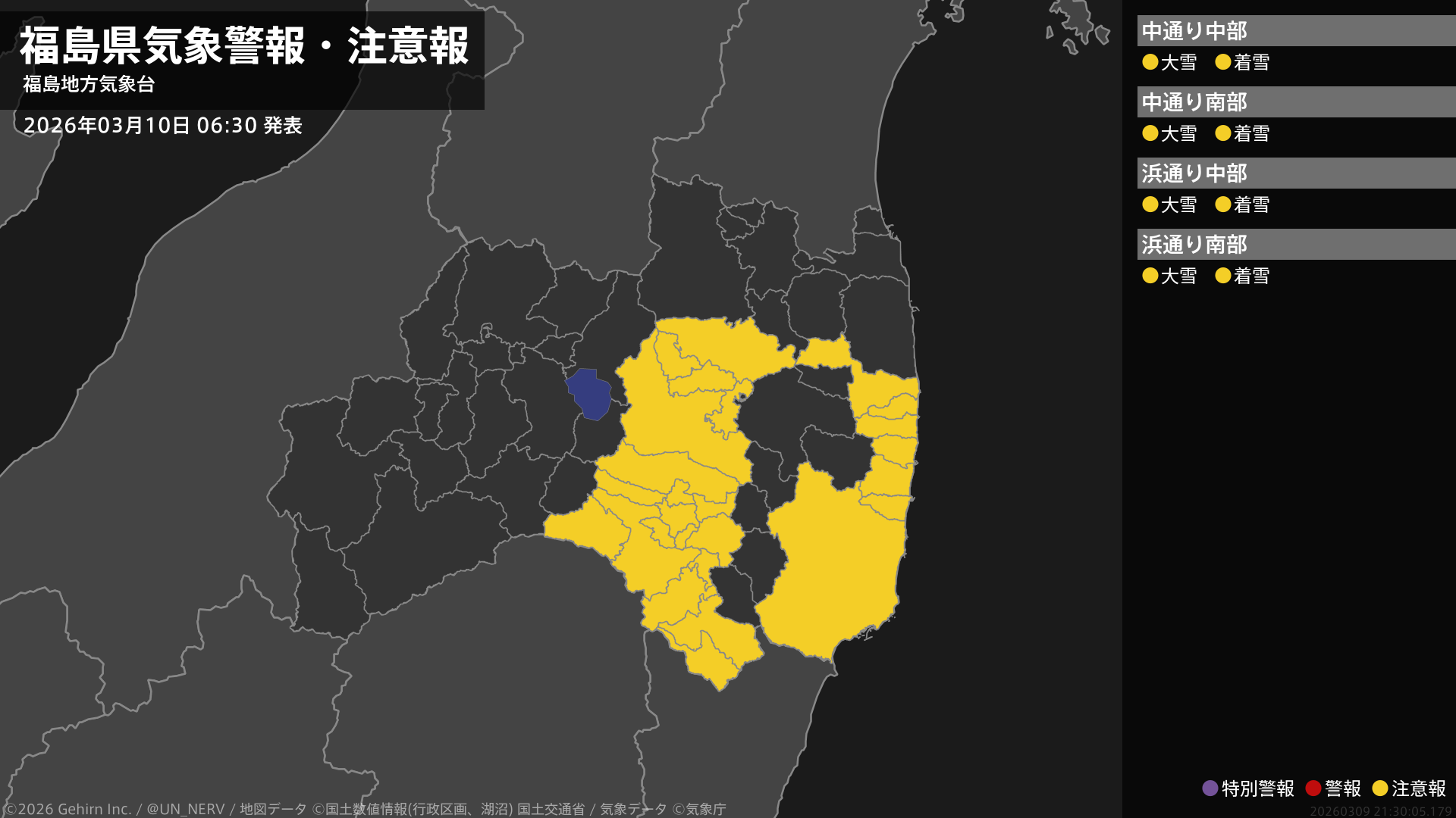 【福島県 気象警報・注意報 2026年03月10日 06:30】中通り、浜通りでは、10日昼前まで大雪や電線等への着雪に注意してください。#気象警報注意報 #福島県