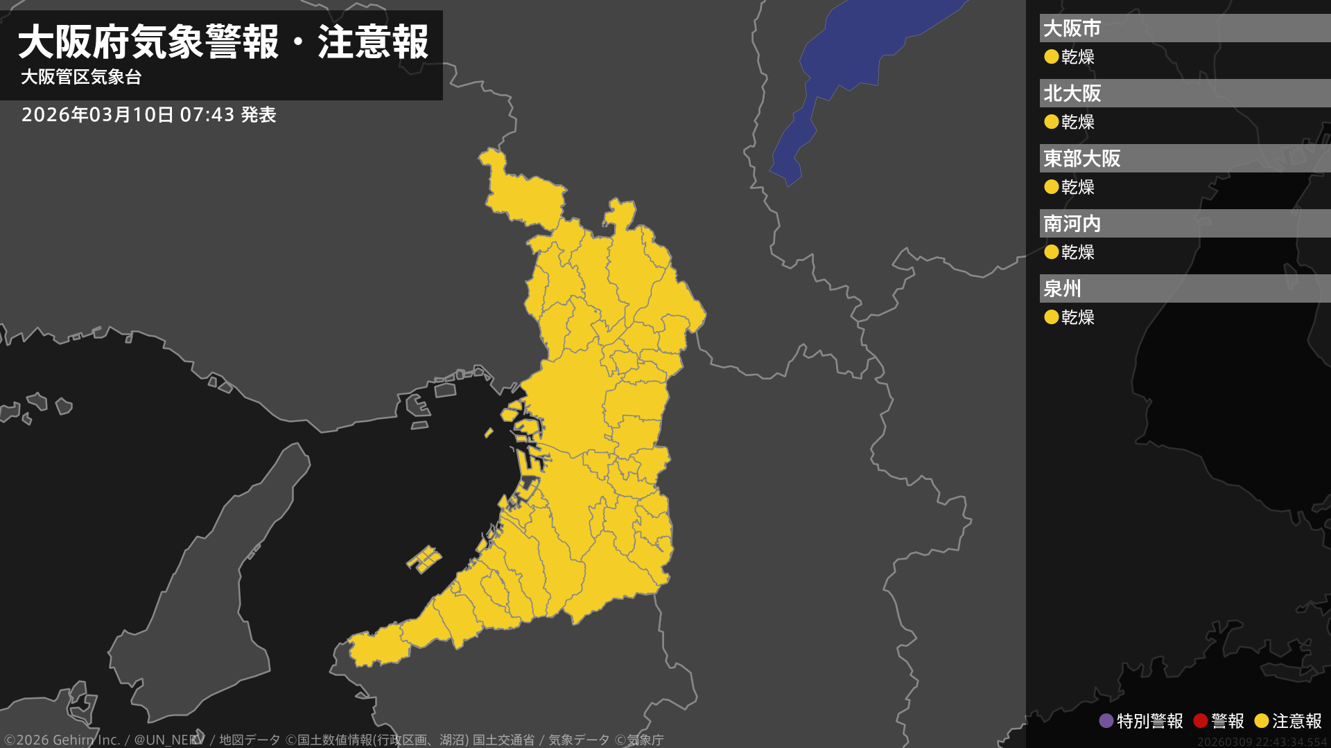 【大阪府 気象警報・注意報 2026年03月10日 07:43】大阪府では、12日まで空気の乾燥した状態が続くため、火の取り扱いに注意してください。#気象警報注意報 #大阪府